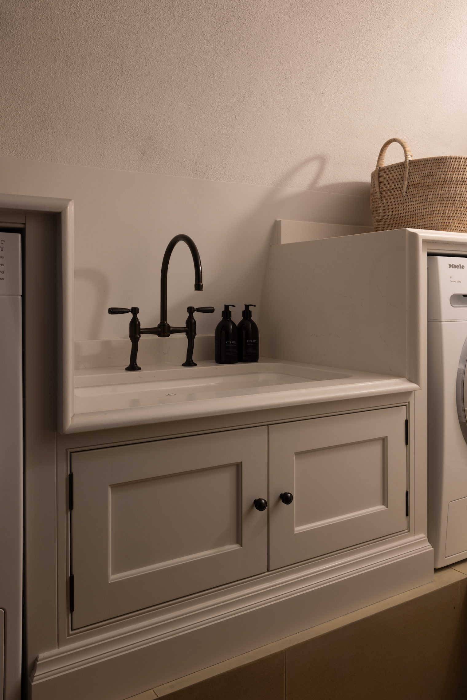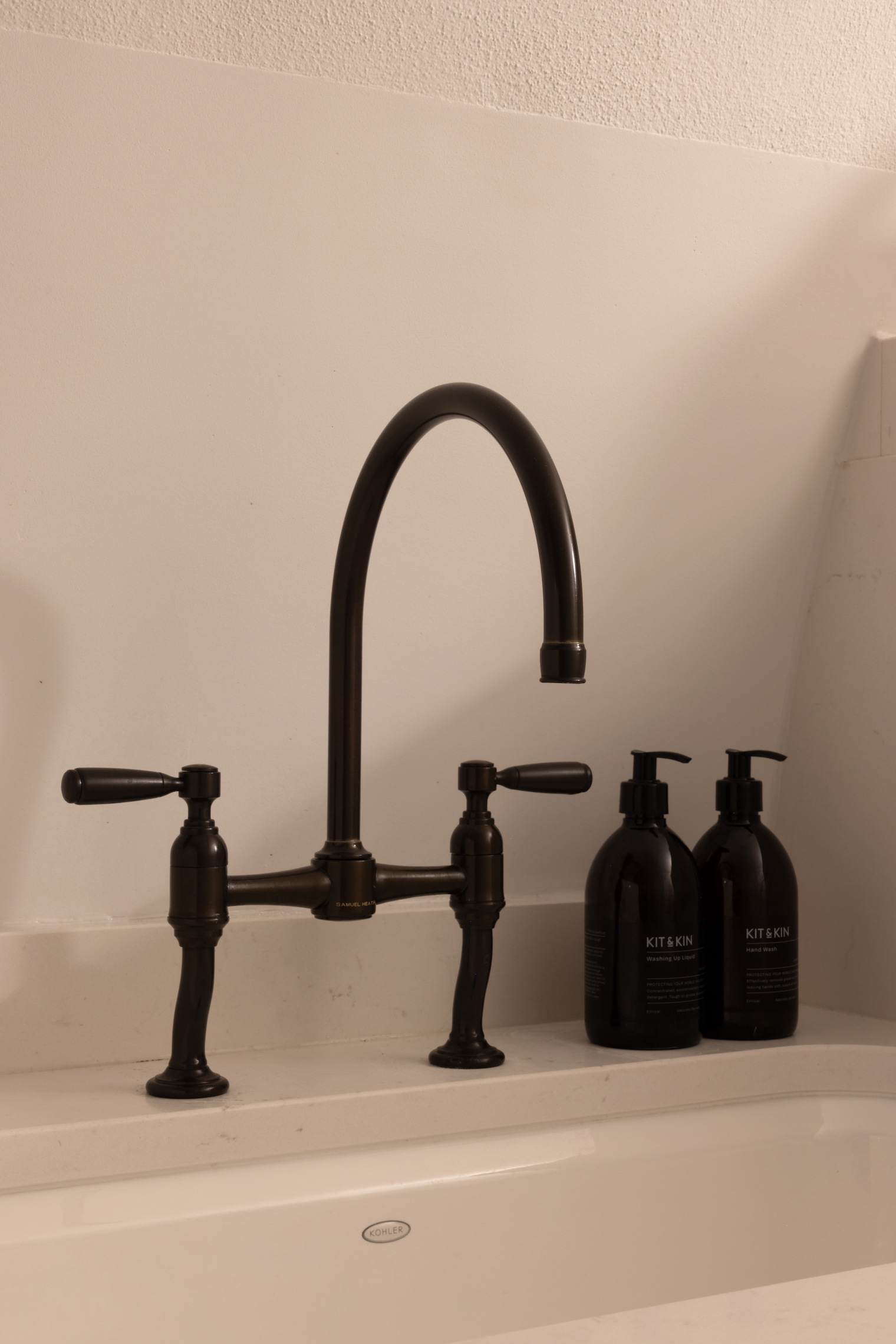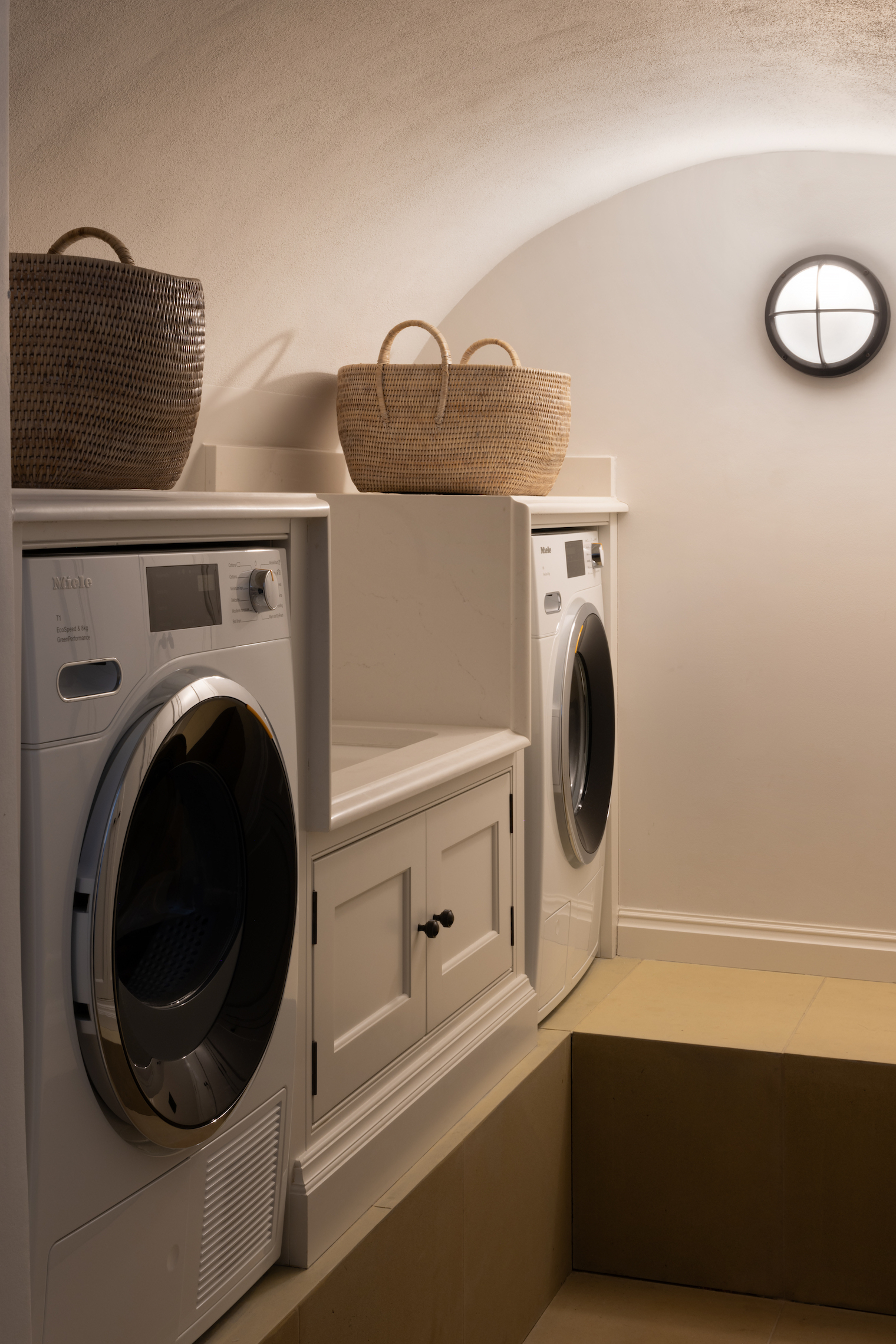 The kitchen, with its rich Greenwich Black Oak and Mainsail palette, was elevated by dark bronze waxed Quilp handles and striking Calacatta Borghini marble worktops sourced from Italy. In the drawing room, the Berkeley Oak bar – flanked by elegant red wine display units -became a sophisticated yet welcoming focal point. Meanwhile, the utility room, nestled within the vaults, presented a unique design challenge due to its shape and multiple service access points, but was transformed into a beautifully efficient space, complete with a Samuel Heath tap as the perfect finishing touch.