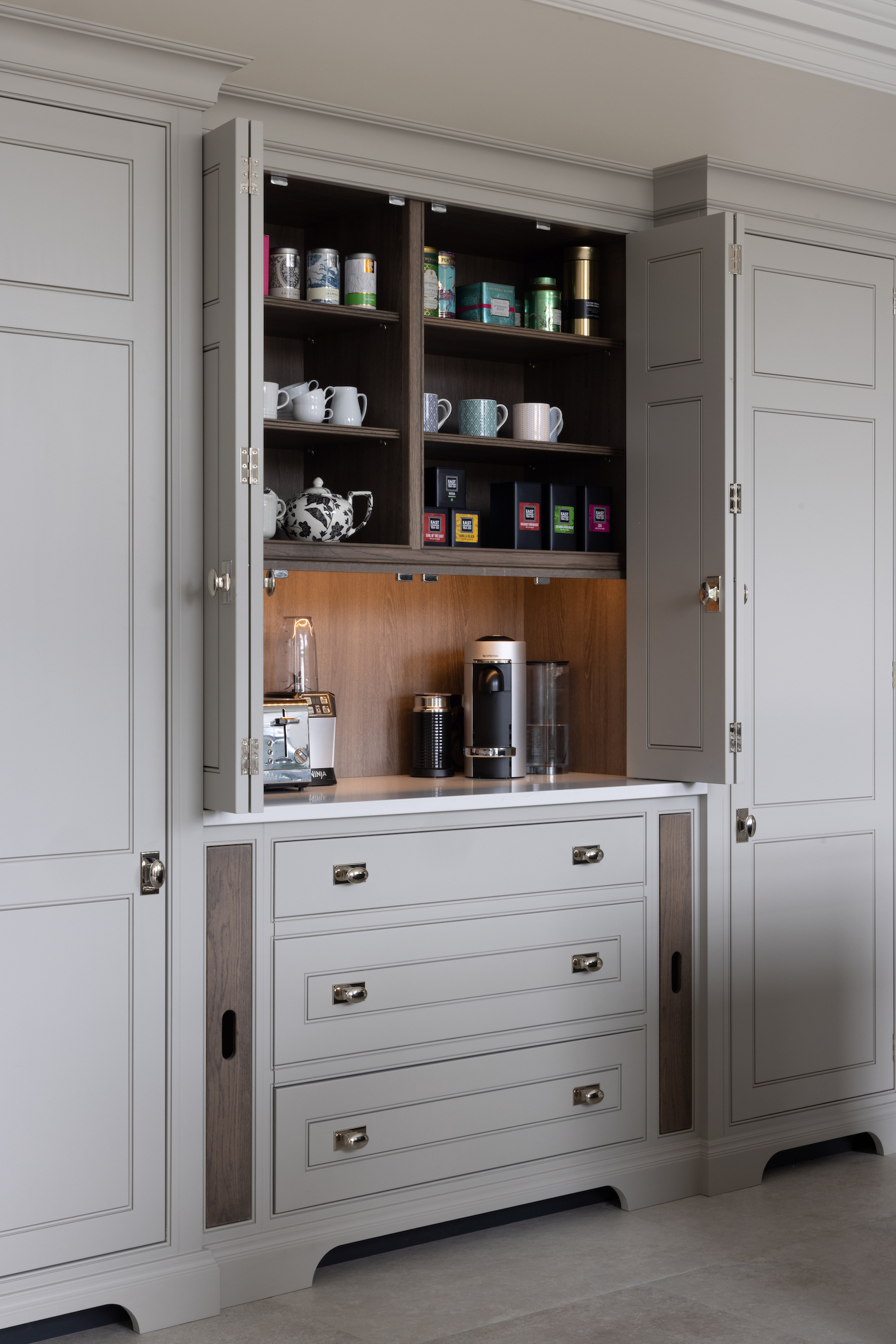We’re proud to design and manufacture all our kitchens at our workshop in Felsted where the traditional joinery of the past meets the technical innovation of the present. We employ only the finest cabinetmakers whose passion for their craft is proudly displayed in each beautiful handmade kitchen. As well as kitchens, we also design, manufacture and install cabinetry throughout the rest of the home. In order to offer a truly bespoke kitchen design service, we provide a curated selection of accent woods, worktops and hardware along with our own paint range produced exclusively for Humphrey Munson by Mylands.