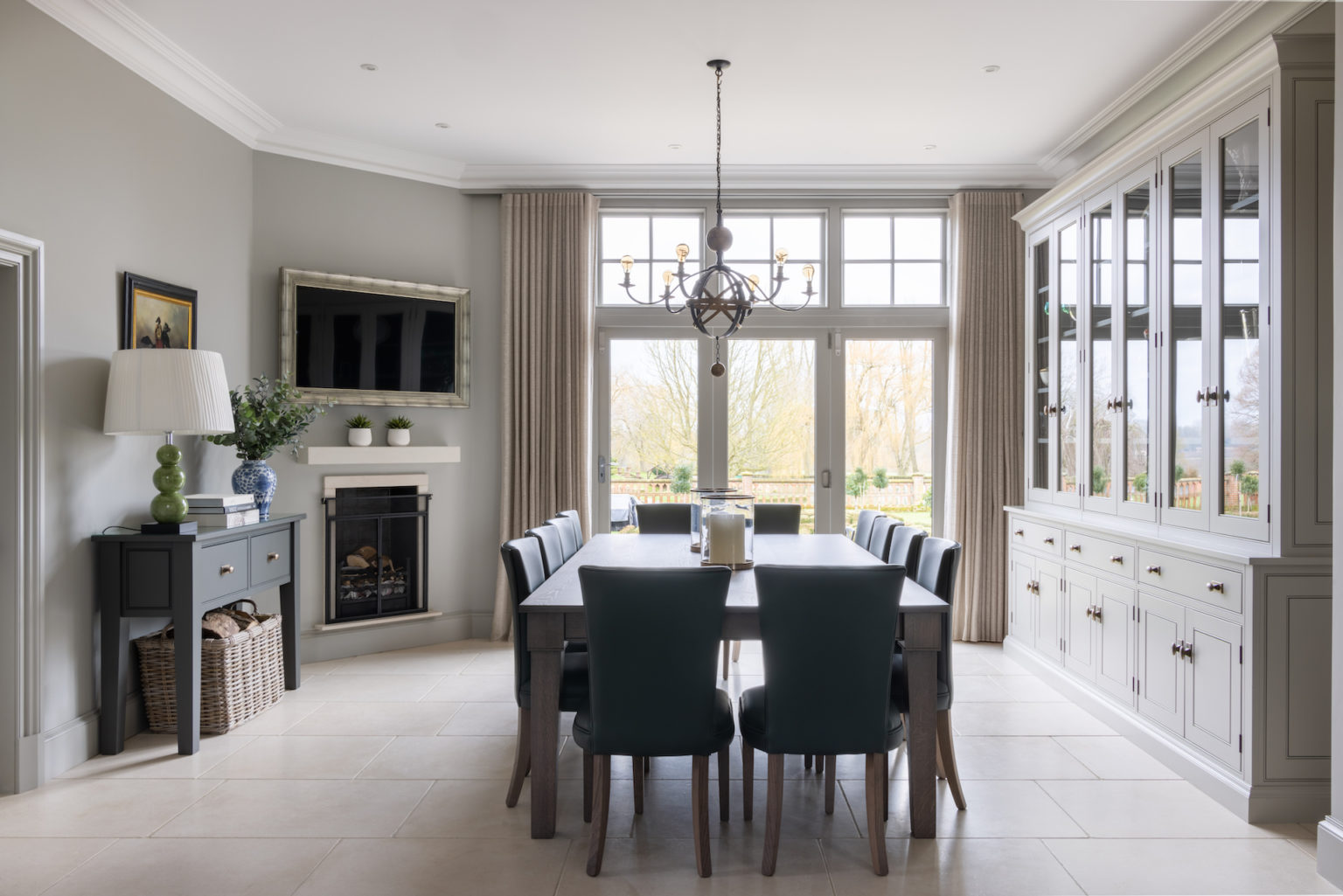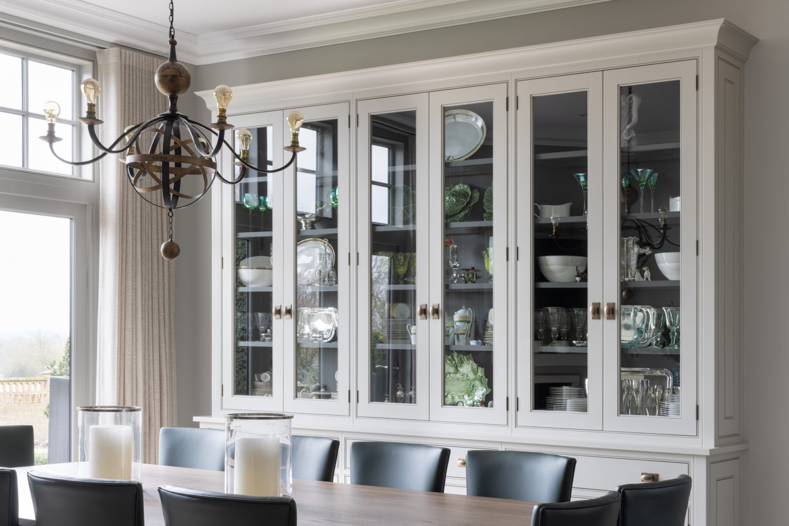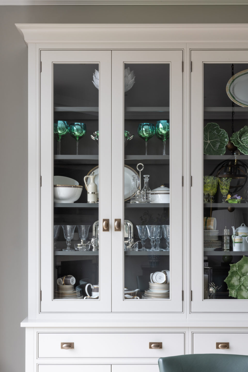 This exceptional Spenlow dining room cabinetry is finished in Half Windsor with contrasting Soot for the interior, which creates an unexpected and daring backdrop for the incredible array of tableware and servingware displayed within.