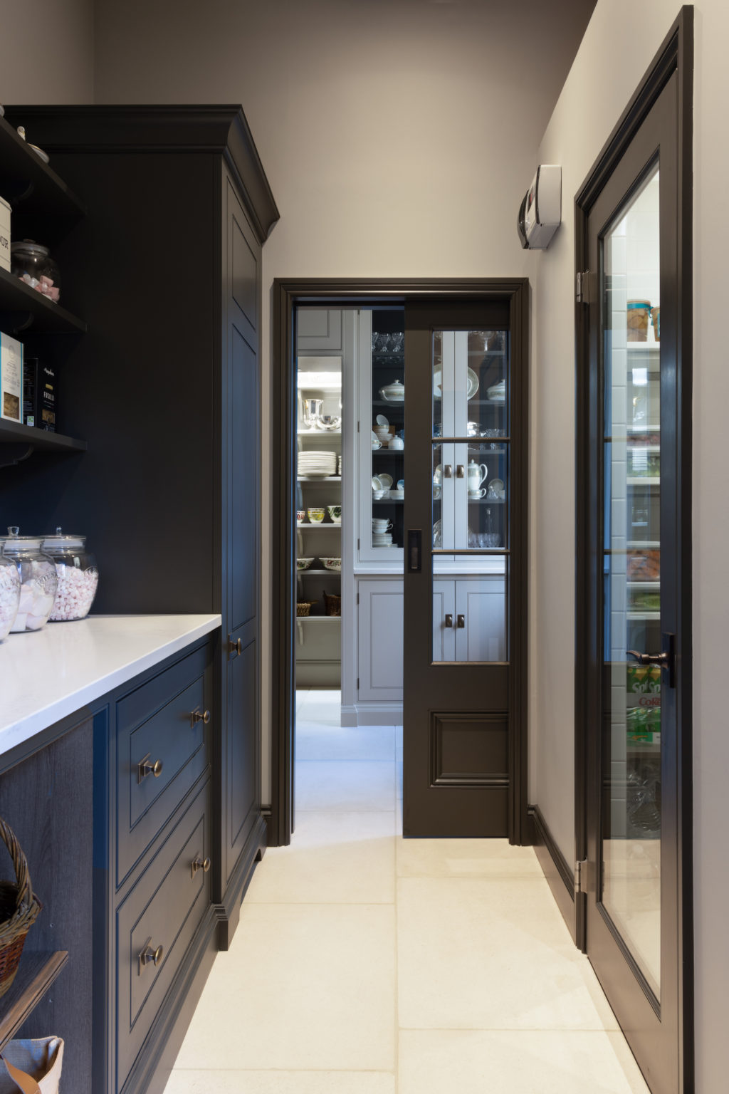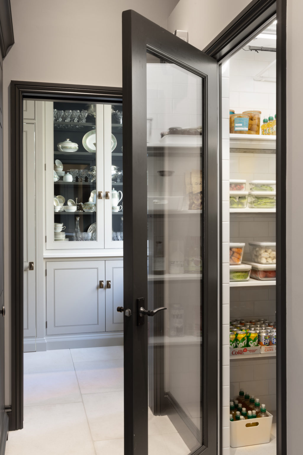 The walk in pantry is typically the room where clients will let go and get daring on their own. It’s just this kind of daredevil spirit that brings a simple room like the pantry alive. This one is particularly impressive with its walk in refrigerator positioned opposite with pocket doors at each end.
