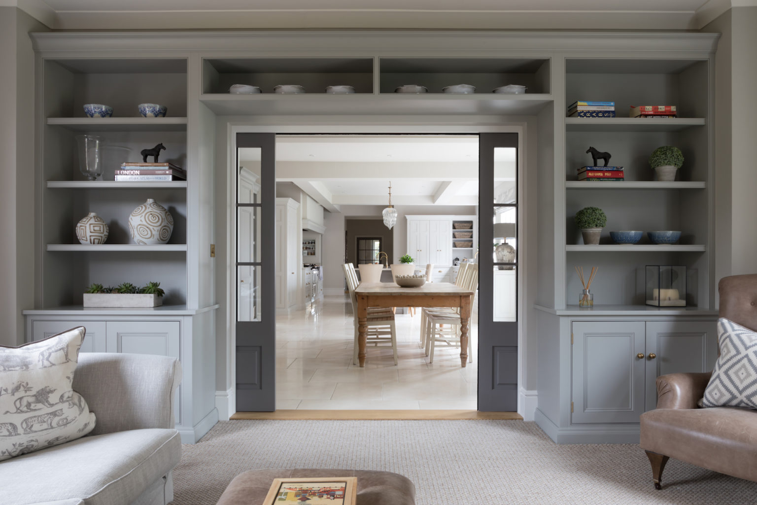Just beyond the kitchen, through two pocket doors sits the cosy snug. Welcoming sofas and integrated cabinetry offer a peaceful refuge in which to relax whilst dinner is in the AGA in the adjoining room.
