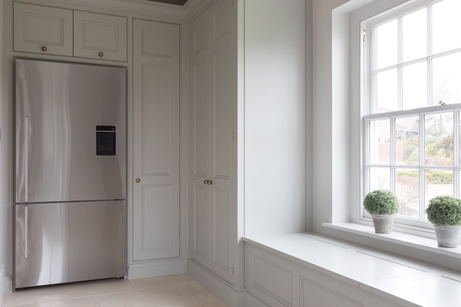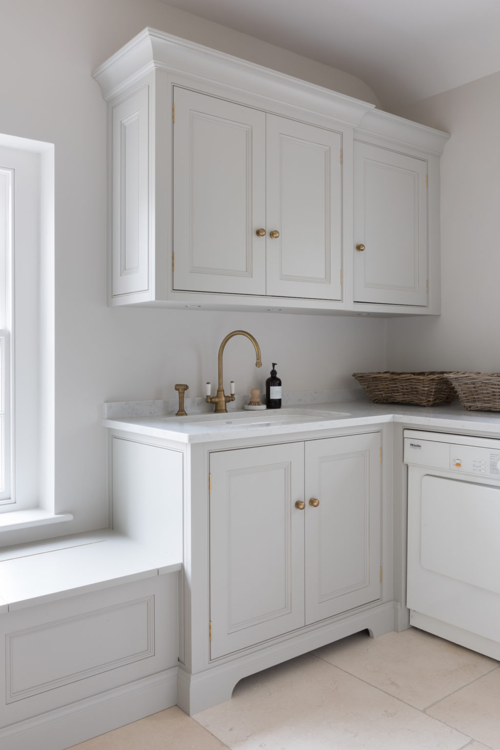 This utility room cabinetry is finished in HM Tailored Grey with aged brass hardware. It’s everything you need in a large country house – plenty of space for washing and drying laundry, storage galore (more is always more!) and overflow cooling thanks to the huge Fisher & Paykel fridge freezer.
