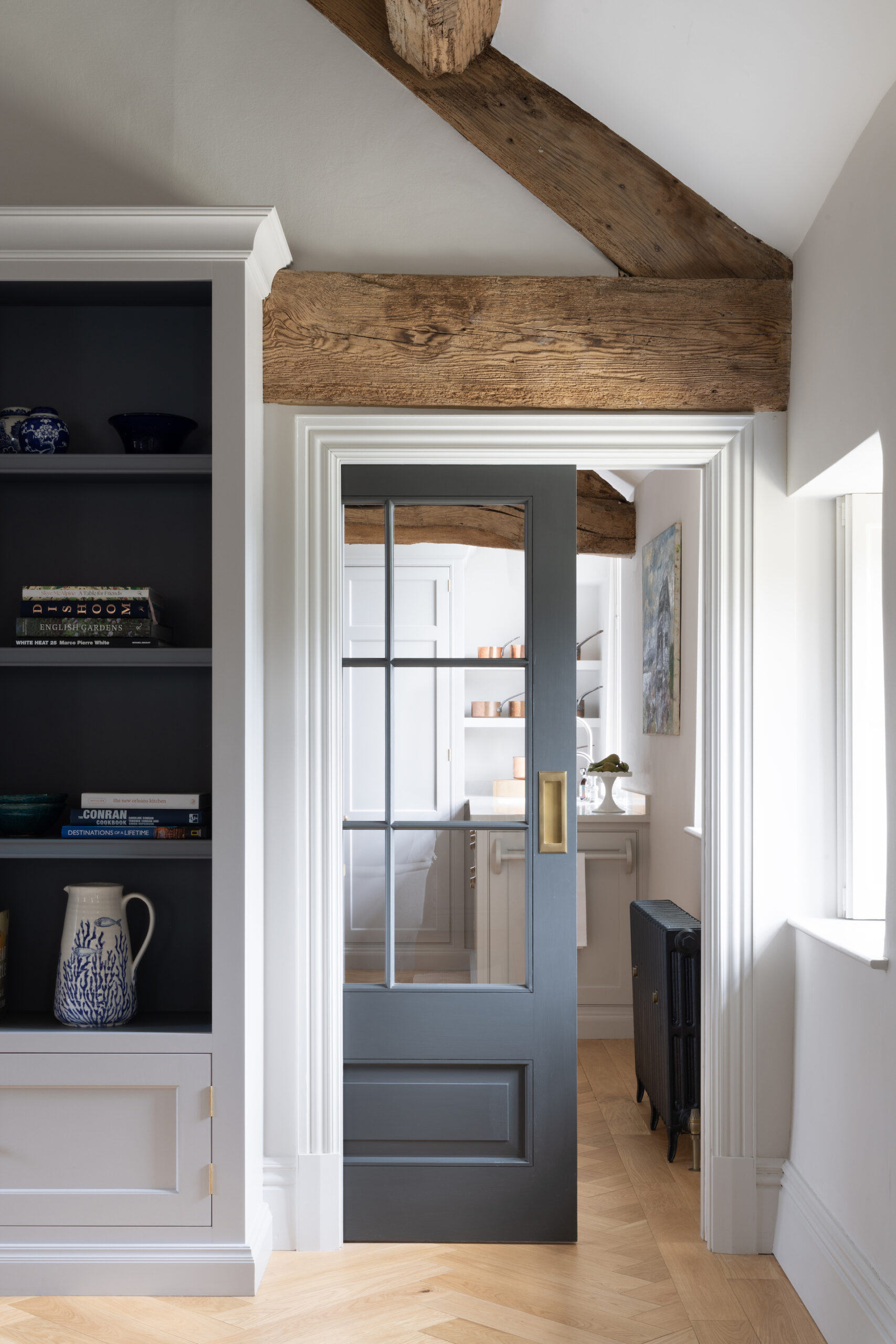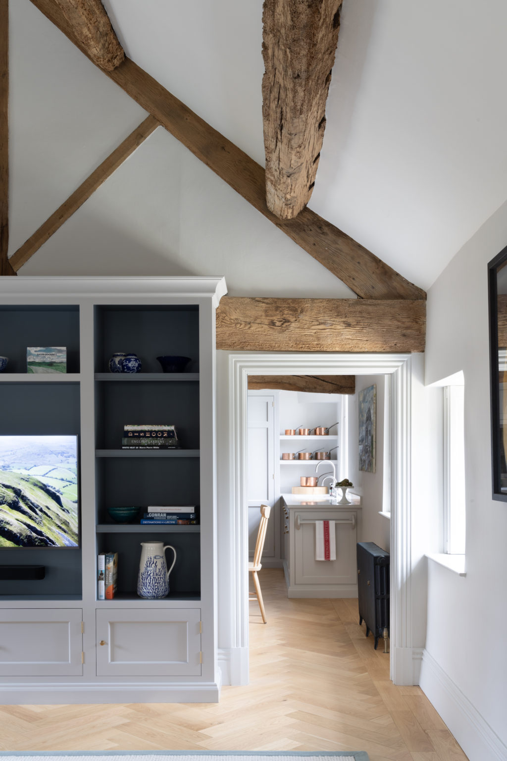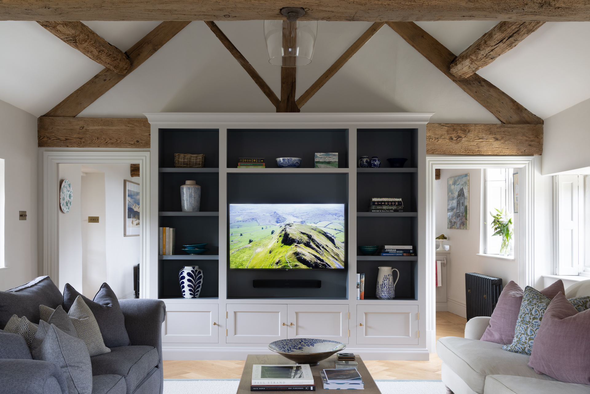 A beautifully renovated Coach House in the heart of the Derbyshire Dales with a Humphrey Munson kitchen at one end and a sitting room with media cabinetry at the other. We loved layering in the different colours in this sitting room space to ensure a soft and muted palette that suits the room perfectly.