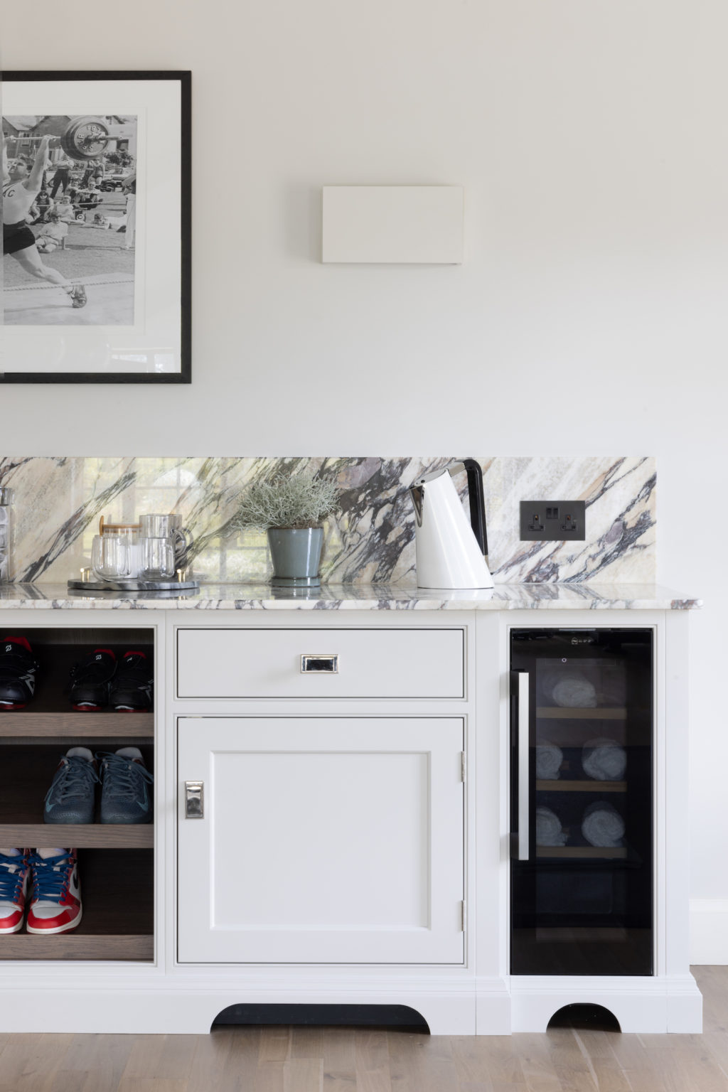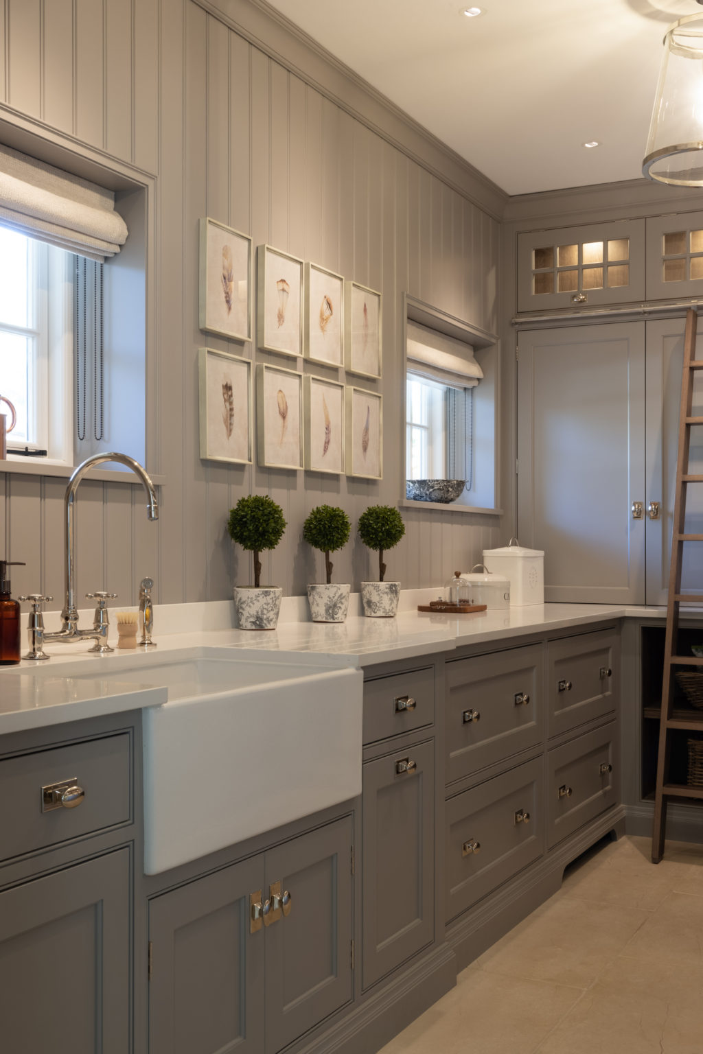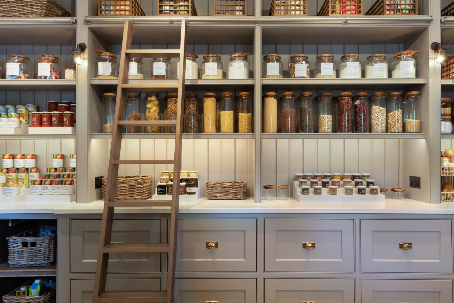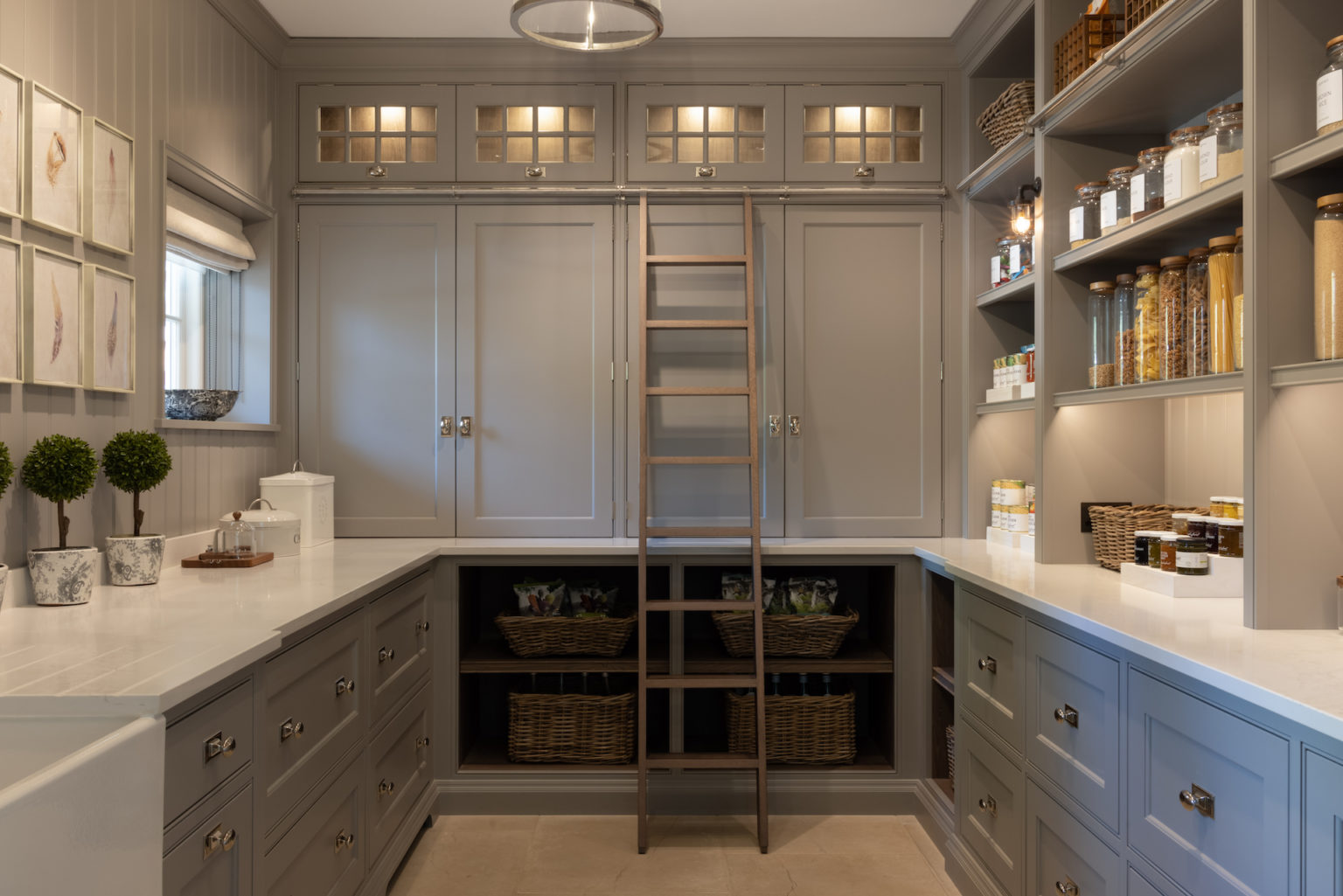 This is the ultimate walk in pantry with every last drop of storage optimised to provide a fully functioning and beautiful space. The extra tall cabinetry includes a bespoke ladder and rail system, which brings texture and character to the design.