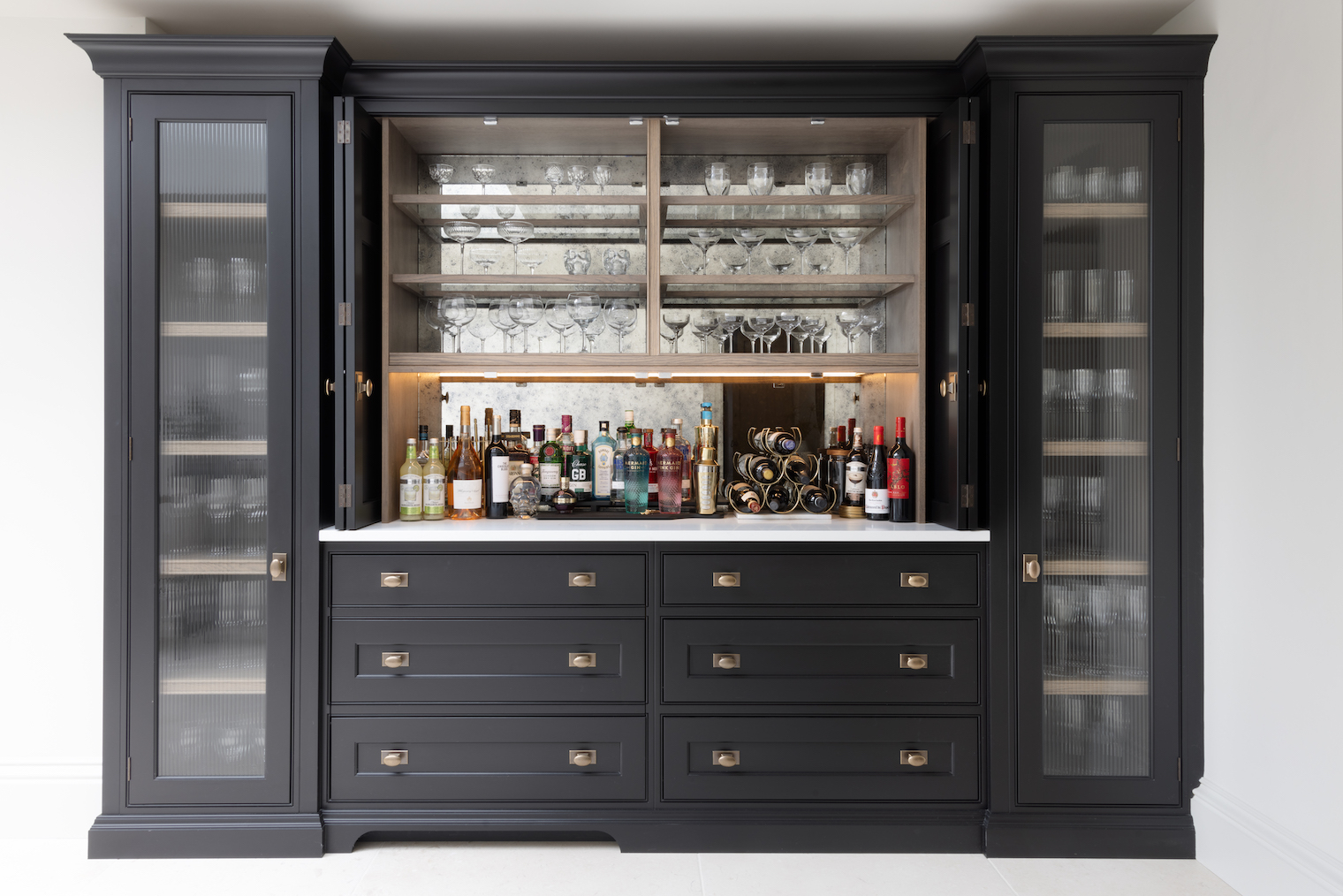 This drinks cabinet holds glassware and bottles, providing a space for preparing and serving cocktails and pre-dinner drinks to guests seated at the nearby formal dining table.