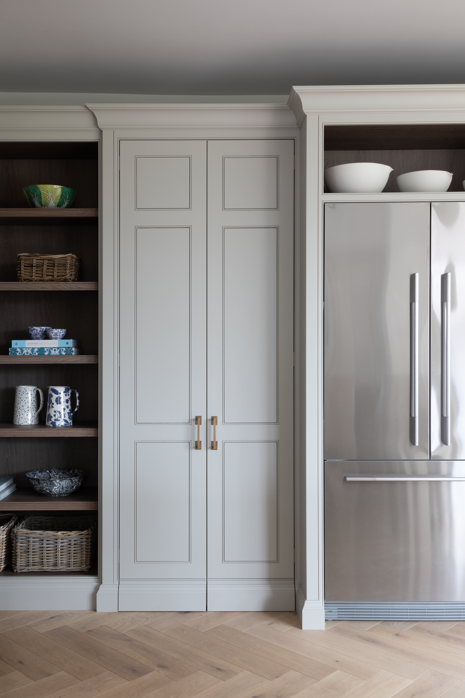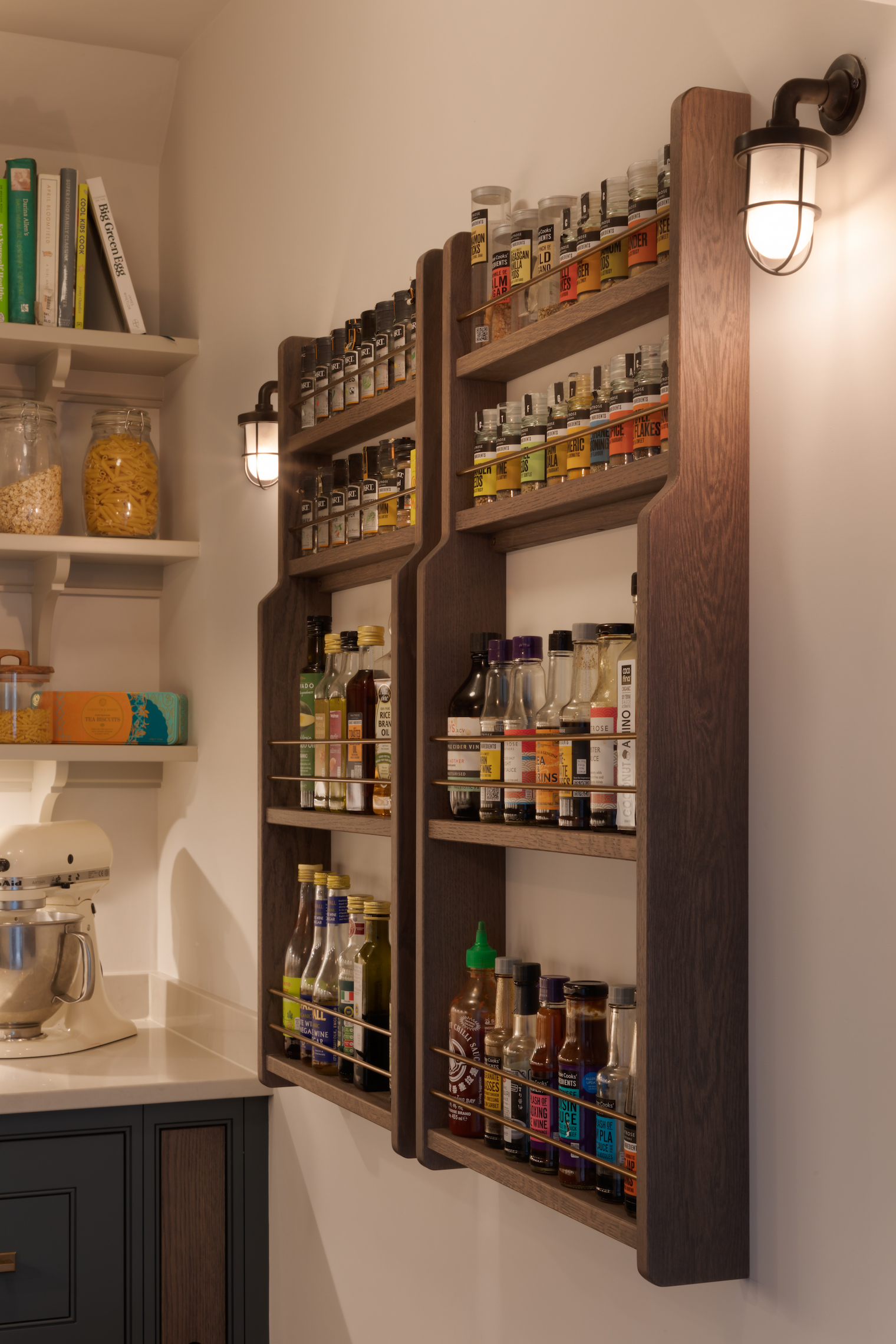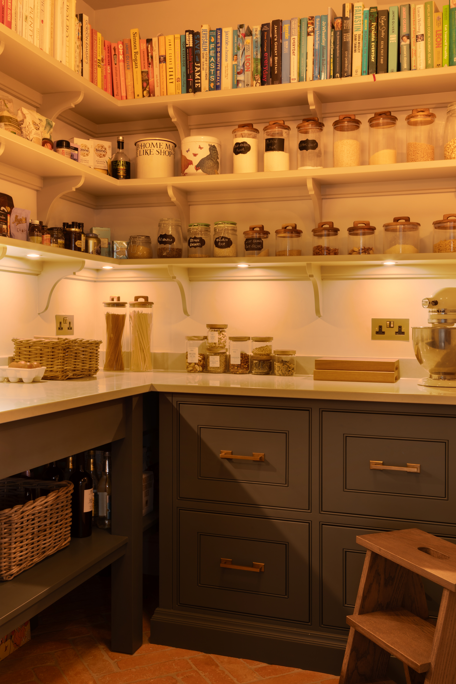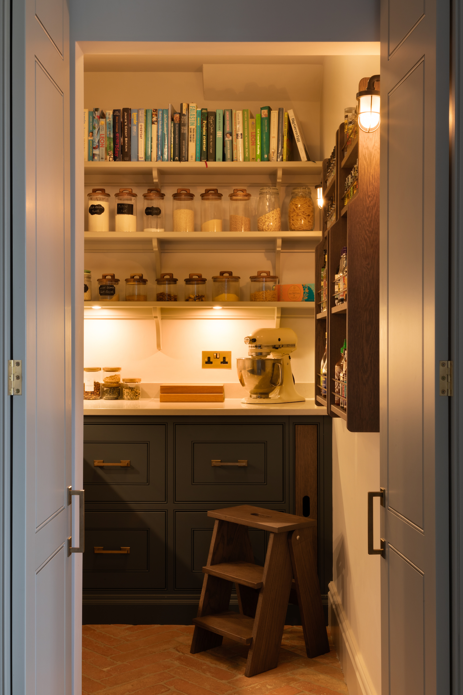 The dream pantry does exist, and it’s cleverly concealed behind custom double Spenlow doors. Complete with open artisan shelving, an abundance of worktop space for both food prep and appliance storage it’s hard not to imagine yourself using this well organised space. A double spice rack and a set of mini steps tops off this…