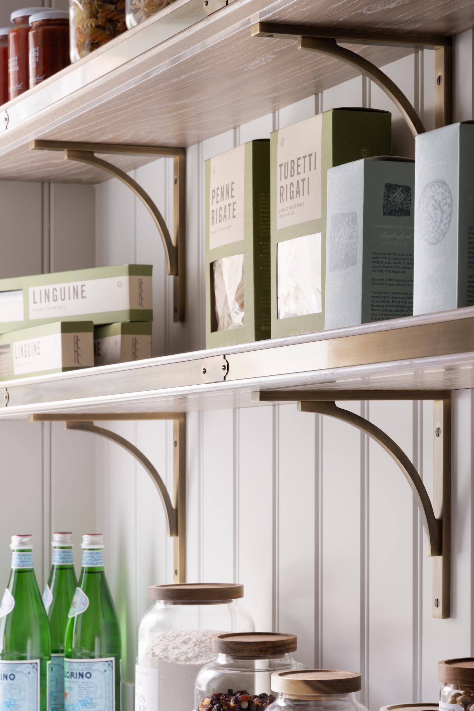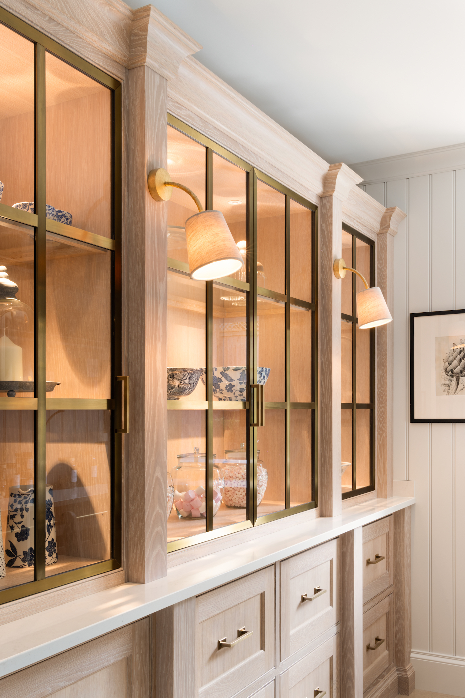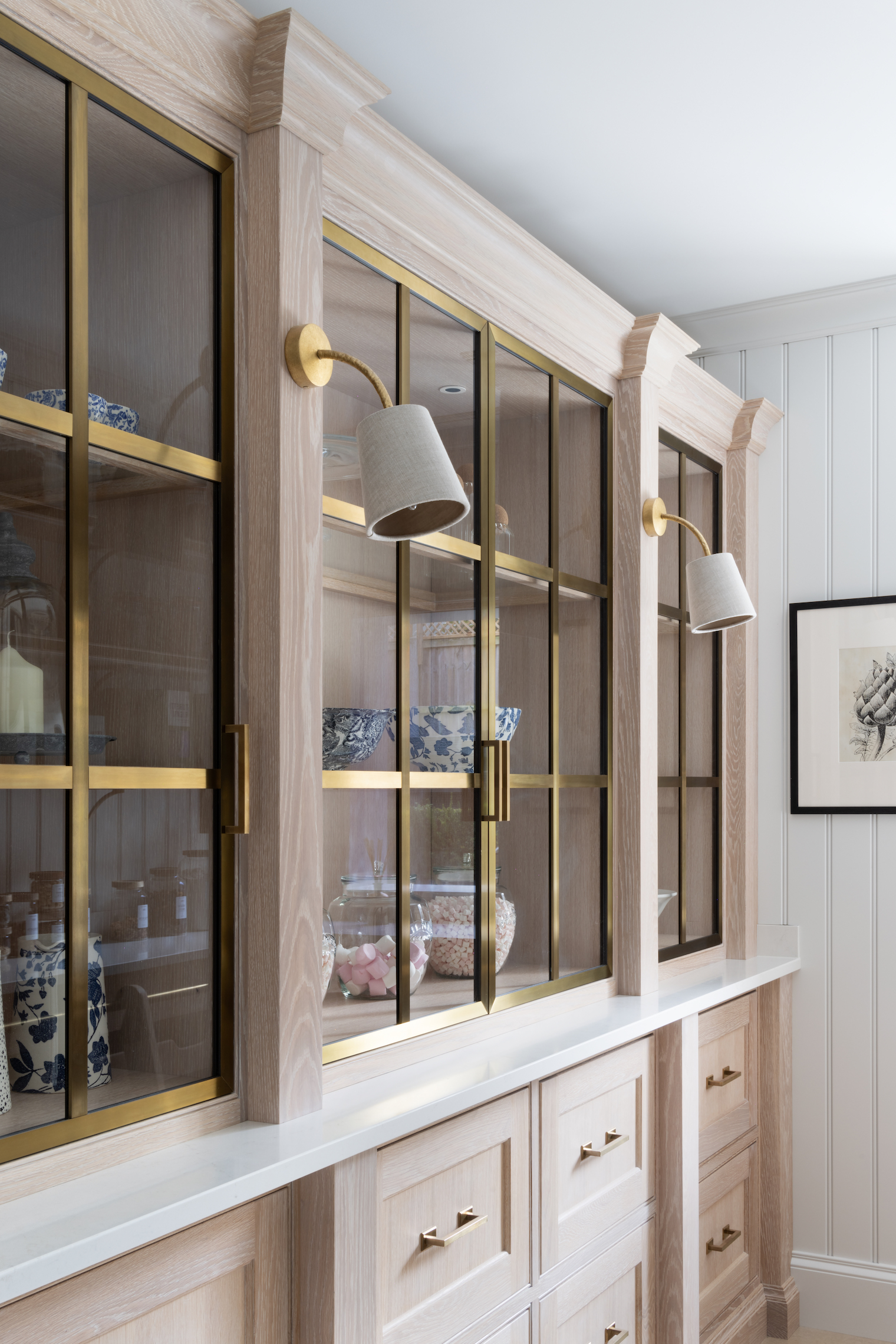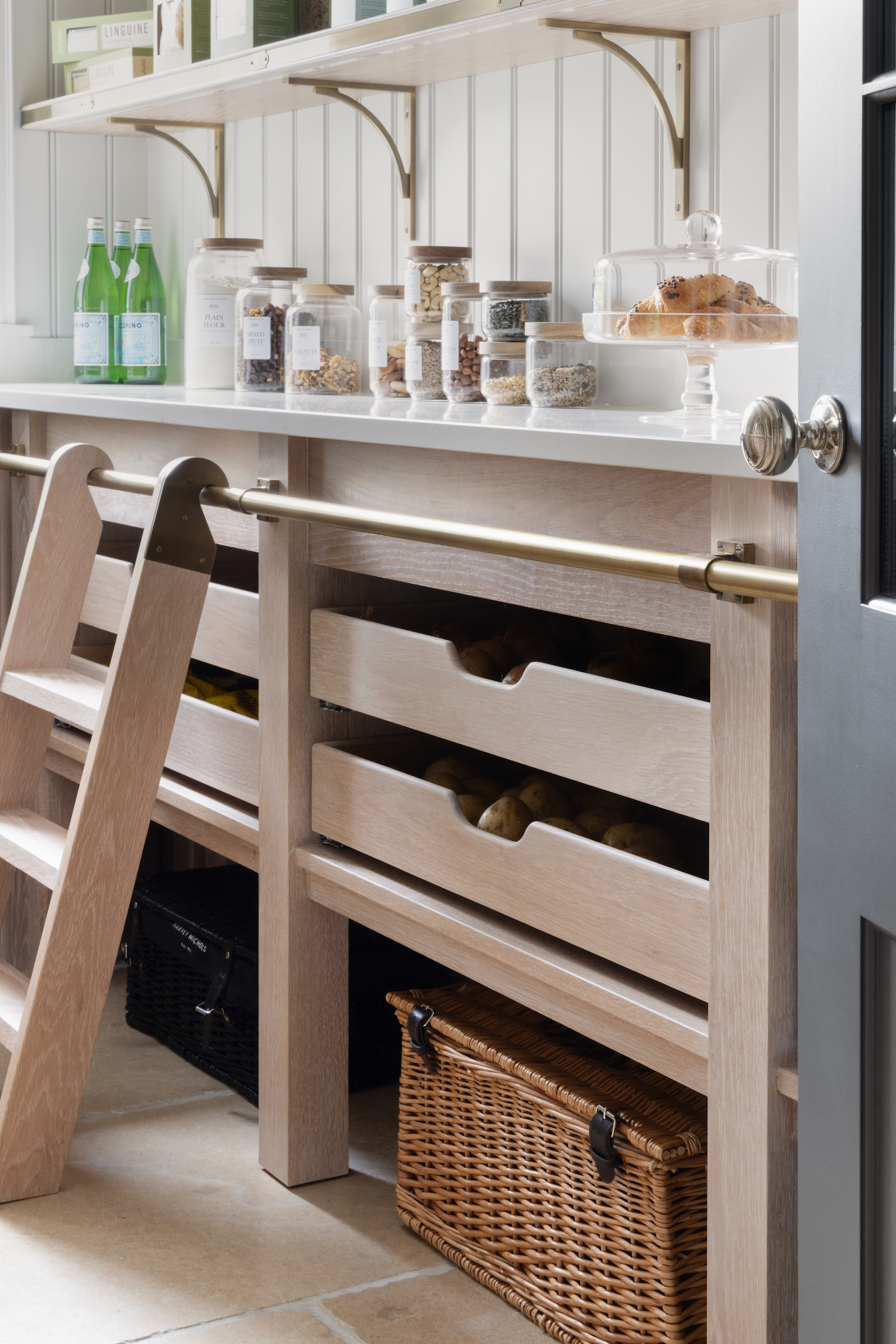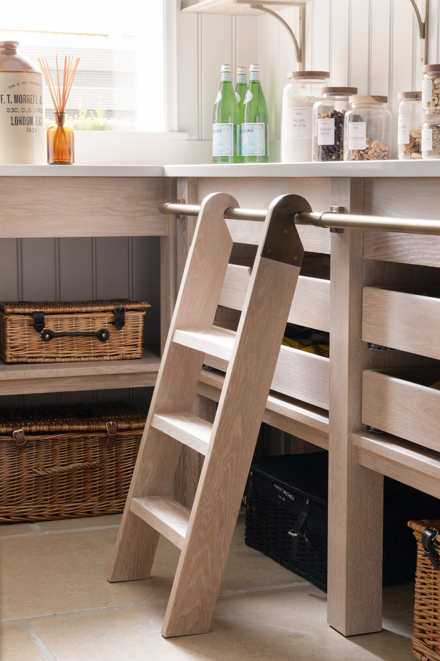 Combining a calming palette of Portman oak and butt & bead panelling in ‘Southwold’ with brass accents throughout, this artisan-crafted design redefines luxury for a traditionally humble room. The bespoke shelving, with its intricate brass detailing, is complemented by a custom ladder and rail system that brings both practicality and charm to the space. The…