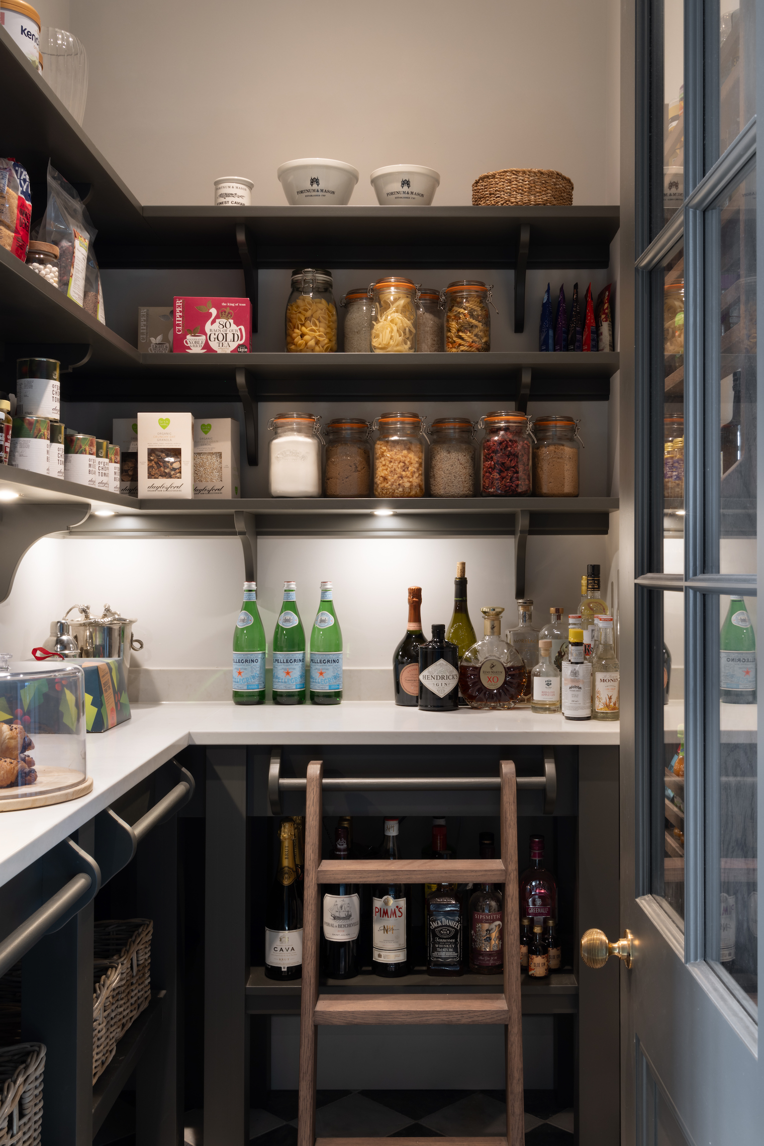A proper walk in pantry designed for food storage galore! Carrying the island colour (“Soot” by HM) through to this room creates continuity in the design and the Kensington chequerboard marble tiles bring a slice of classic English coolness. The half glazed Georgian door by HM finishes the pantry perfectly.