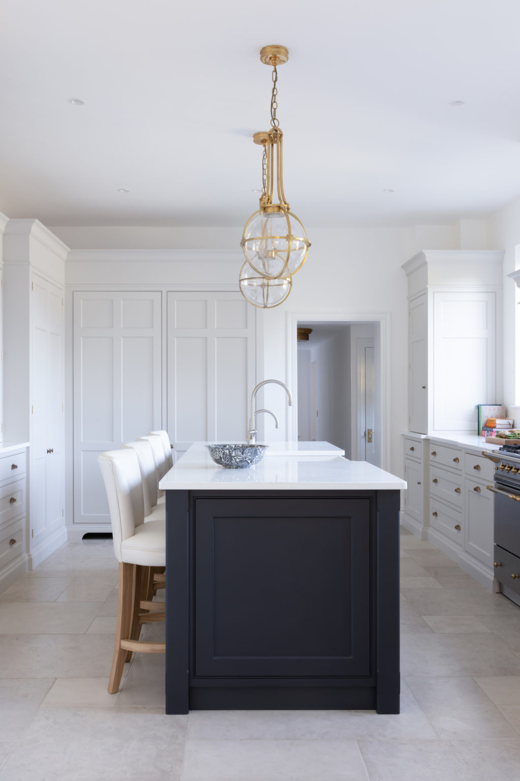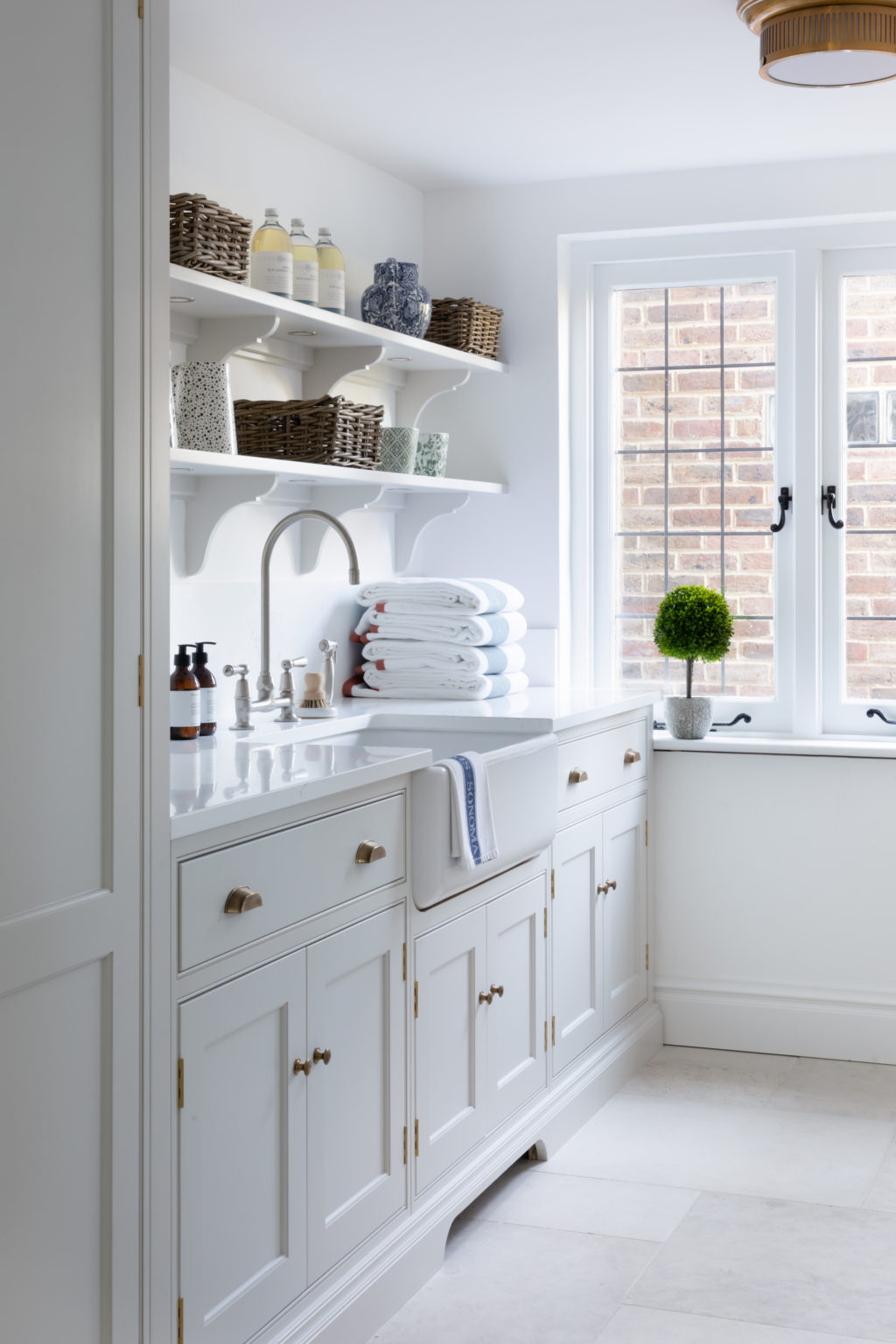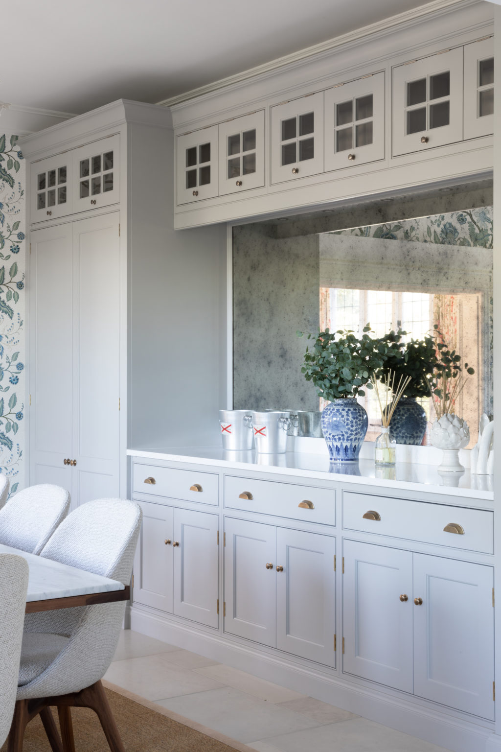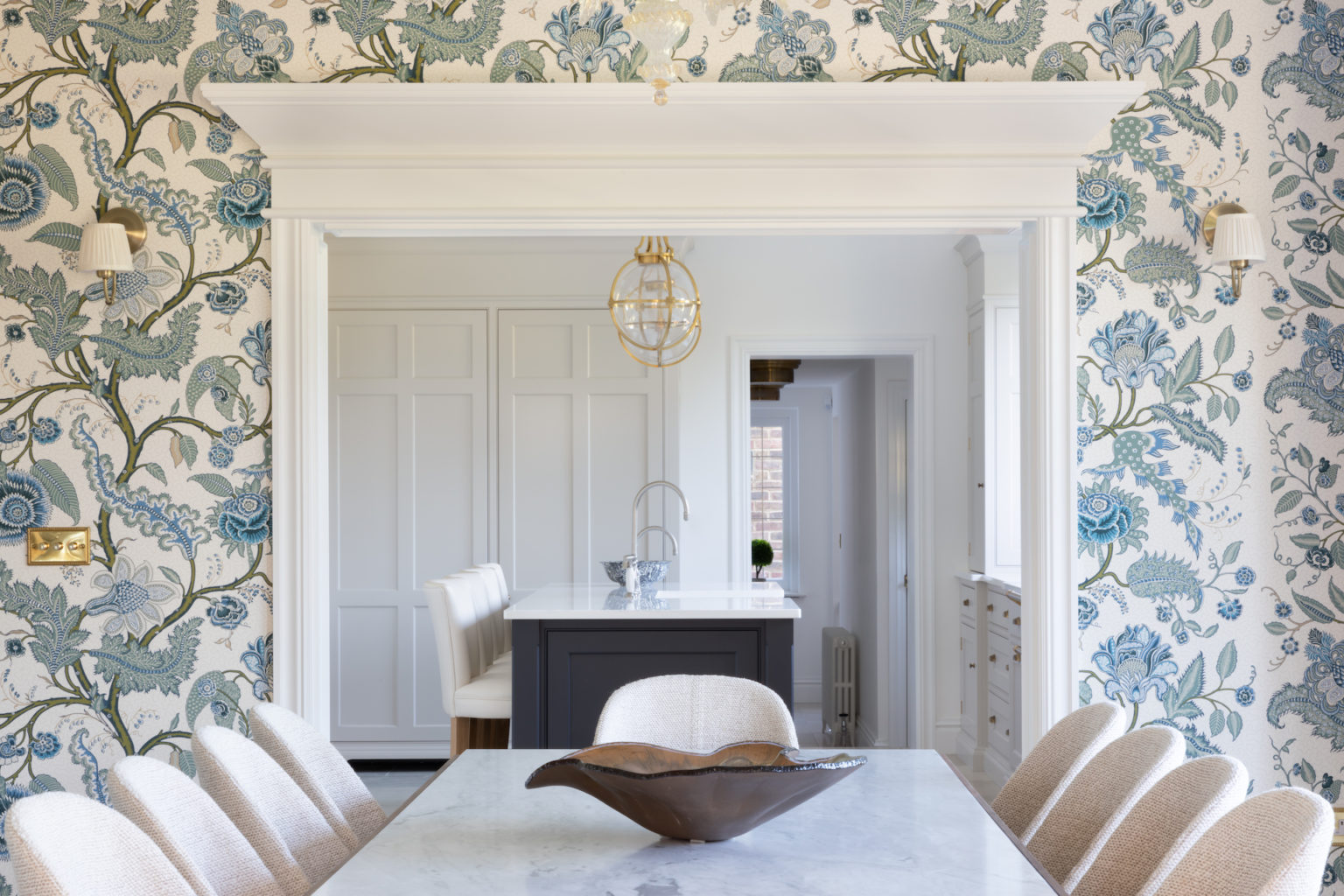 The Royal Tunbridge Wells Project includes a kitchen, adjoining dining room and utility room designed using Nickleby cabinetry with brass accents throughout. The Schumacher wallpaper ‘Sidewall Sinhala’ steals the show as you look through to the kitchen and utility room beyond. A kitchen for all seasons but one that particularly embraces the late Spring into early Summer.