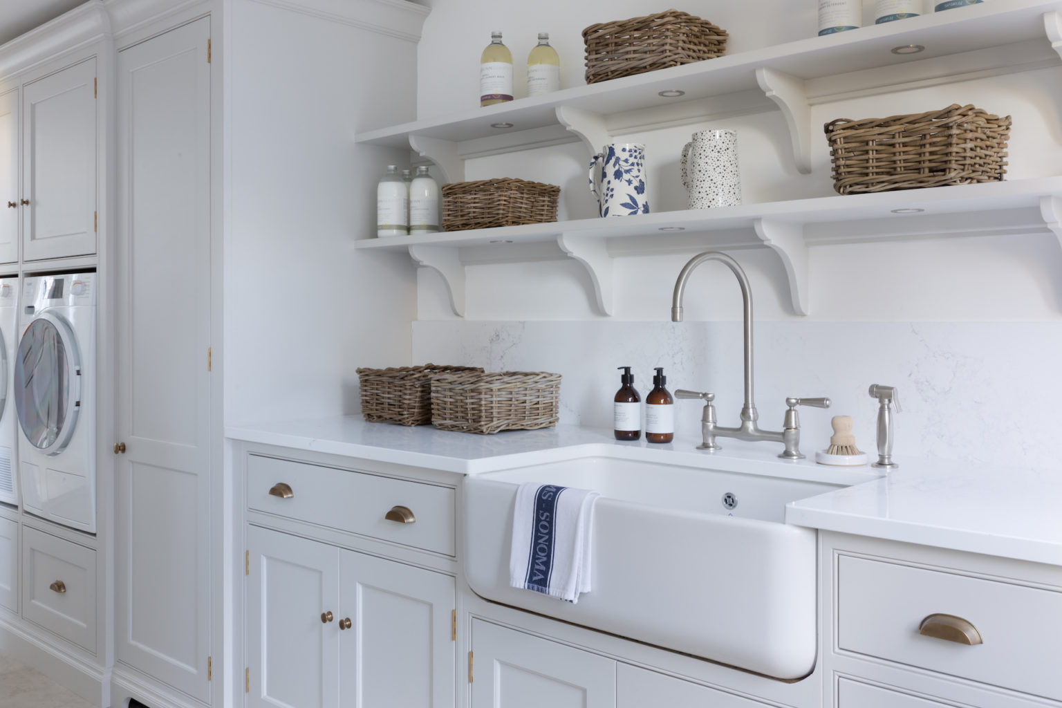 A dream utility space designed in a single run of cabinetry, with Miele laundry appliances built into cabinetry and overflow refrigeration all in the same area. A large butler sink and countertop space with artisan shelving above ensures that perfect balance between style and utility.