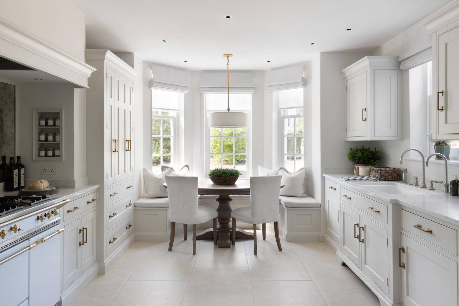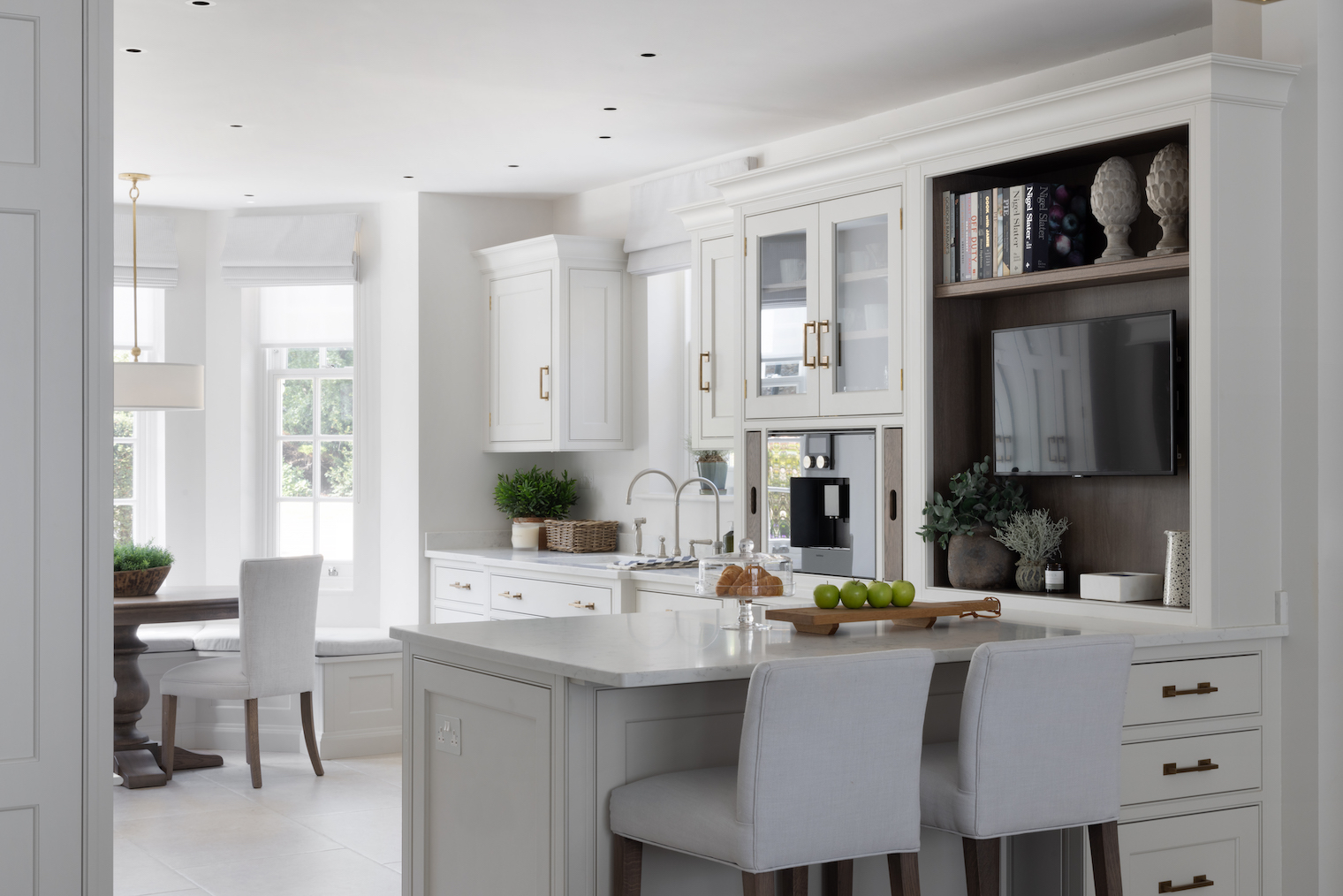 The kitchen at the Sevenoaks project is the heart of the home, designed with clean lines, bespoke Nickleby cabinetry, and a soft, welcoming colour palette to create a space that is both elegant and practical for a busy family.