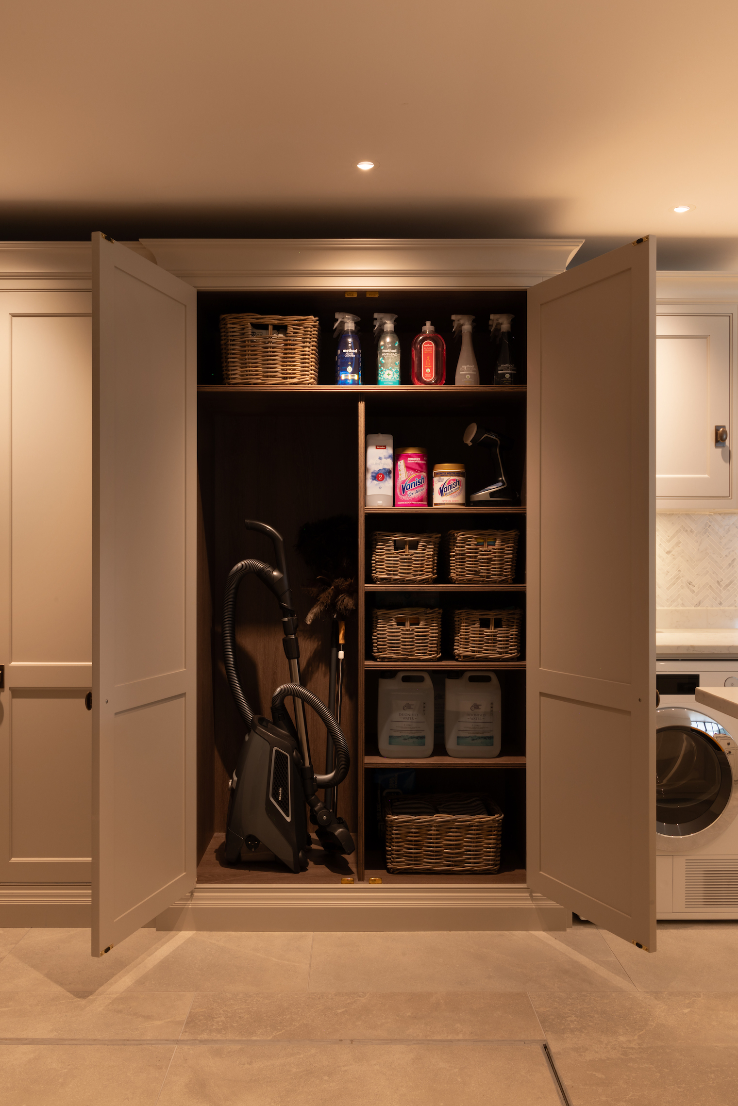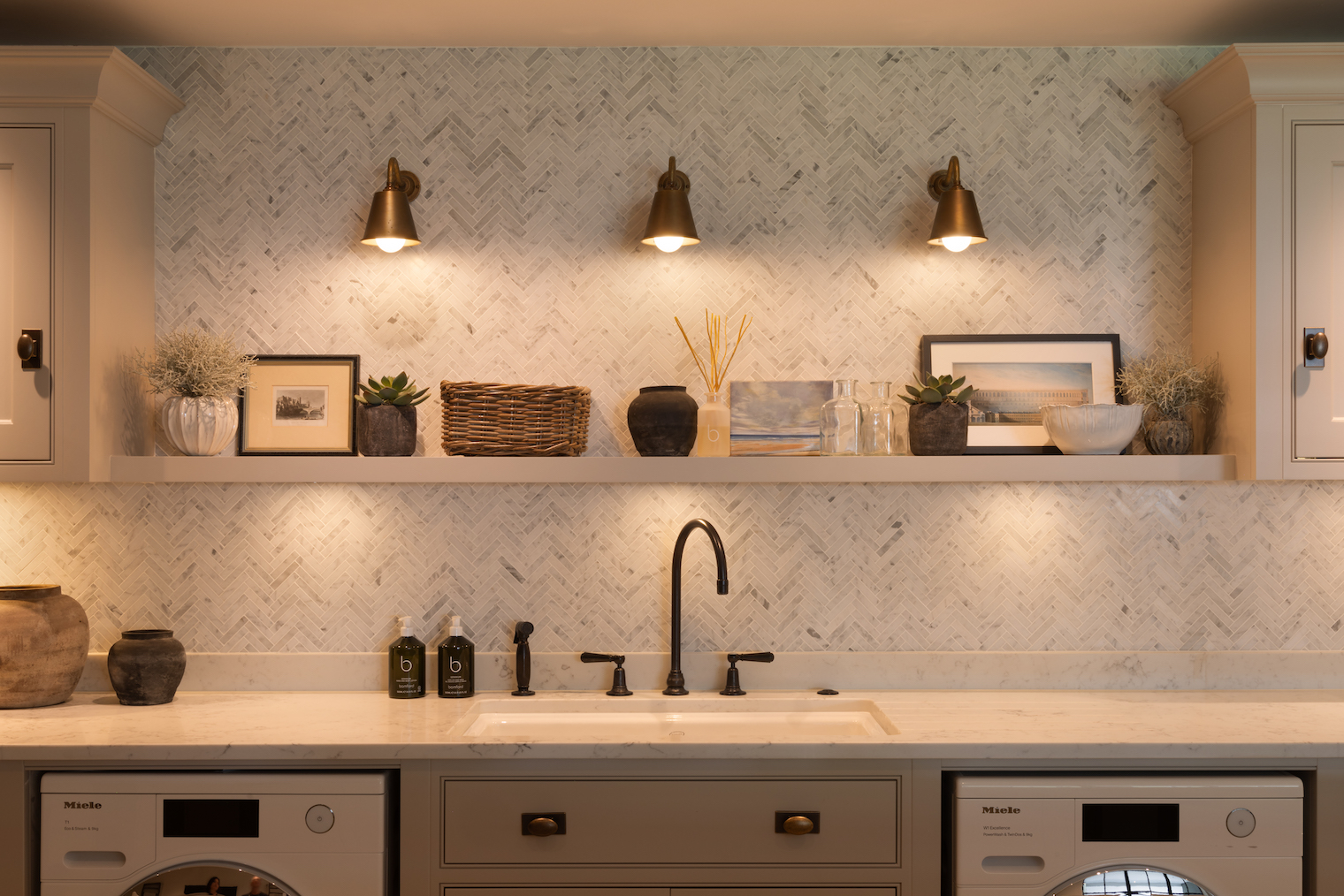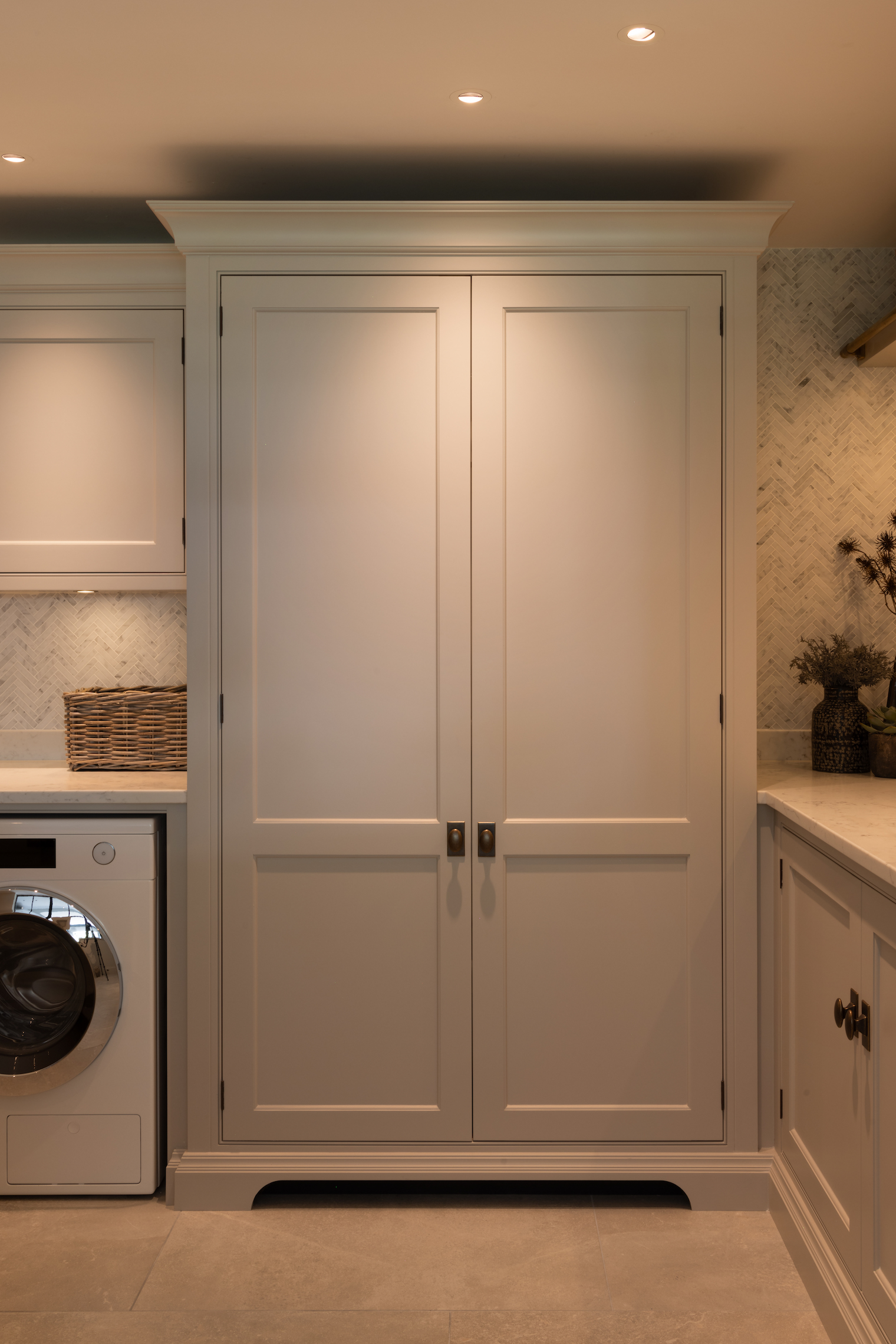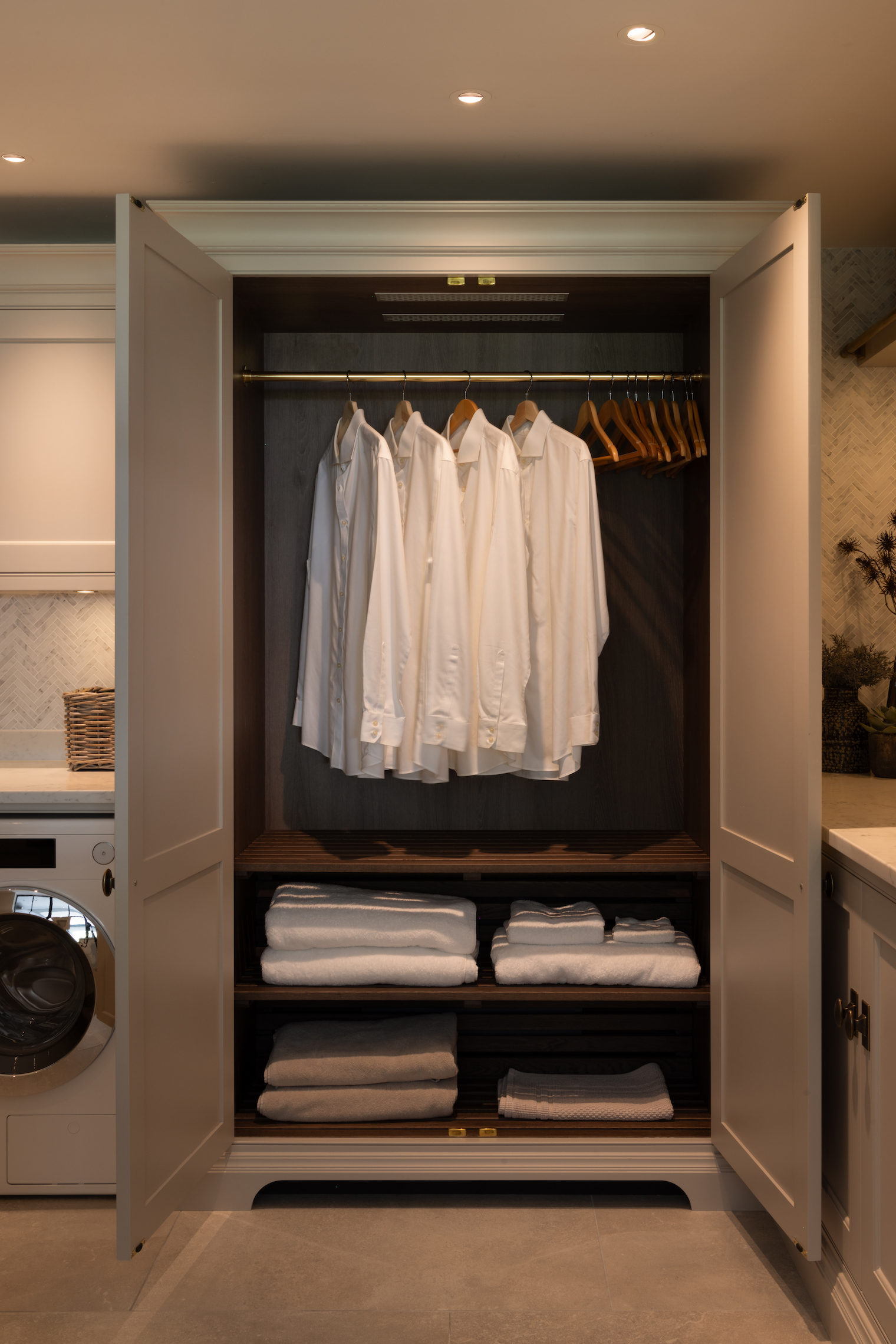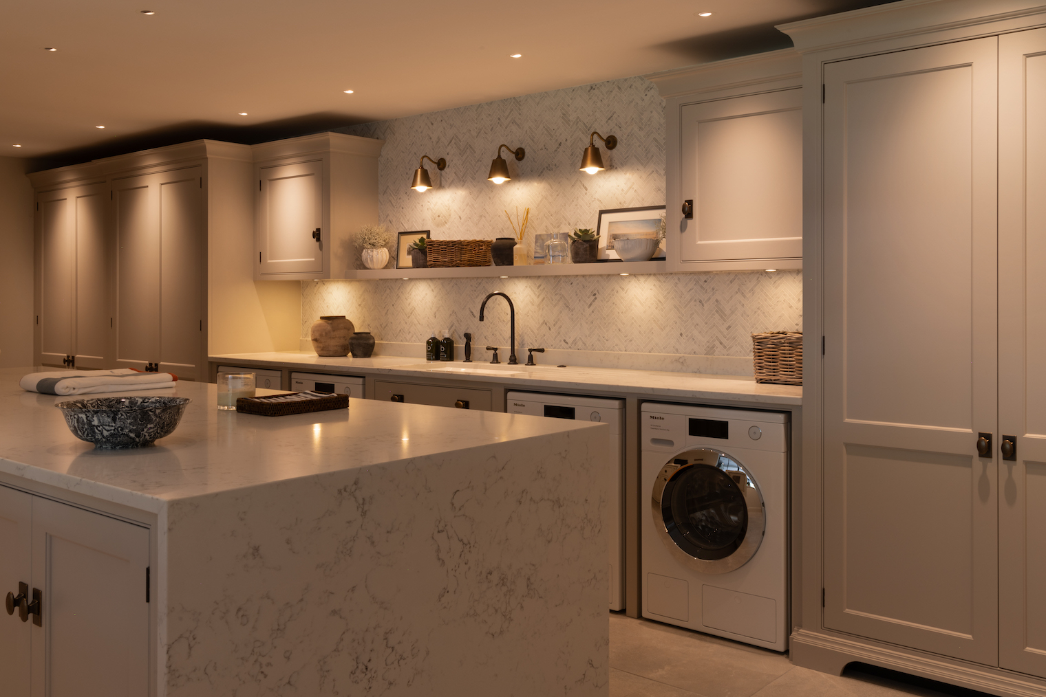 Laundry room of dreams! This epic space was designed to be as practical as it is beautiful, combining classic design with modern convenience. A calm, neutral palette and clean, structured lines ensure the room remains in harmony with the rest of the home while providing ample storage and work surfaces for the family’s daily needs.