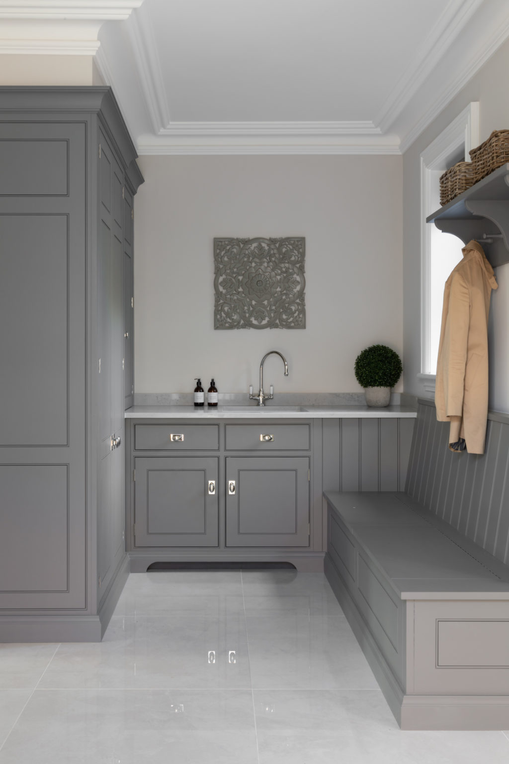A boot room design that perfectly balances tall closed cabinetry, an everyday bench seat with hooks and artisan shelf above and a sink run. ‘Duffle’ – a bespoke colour to HM – is the perfect tome for this hard-working area.