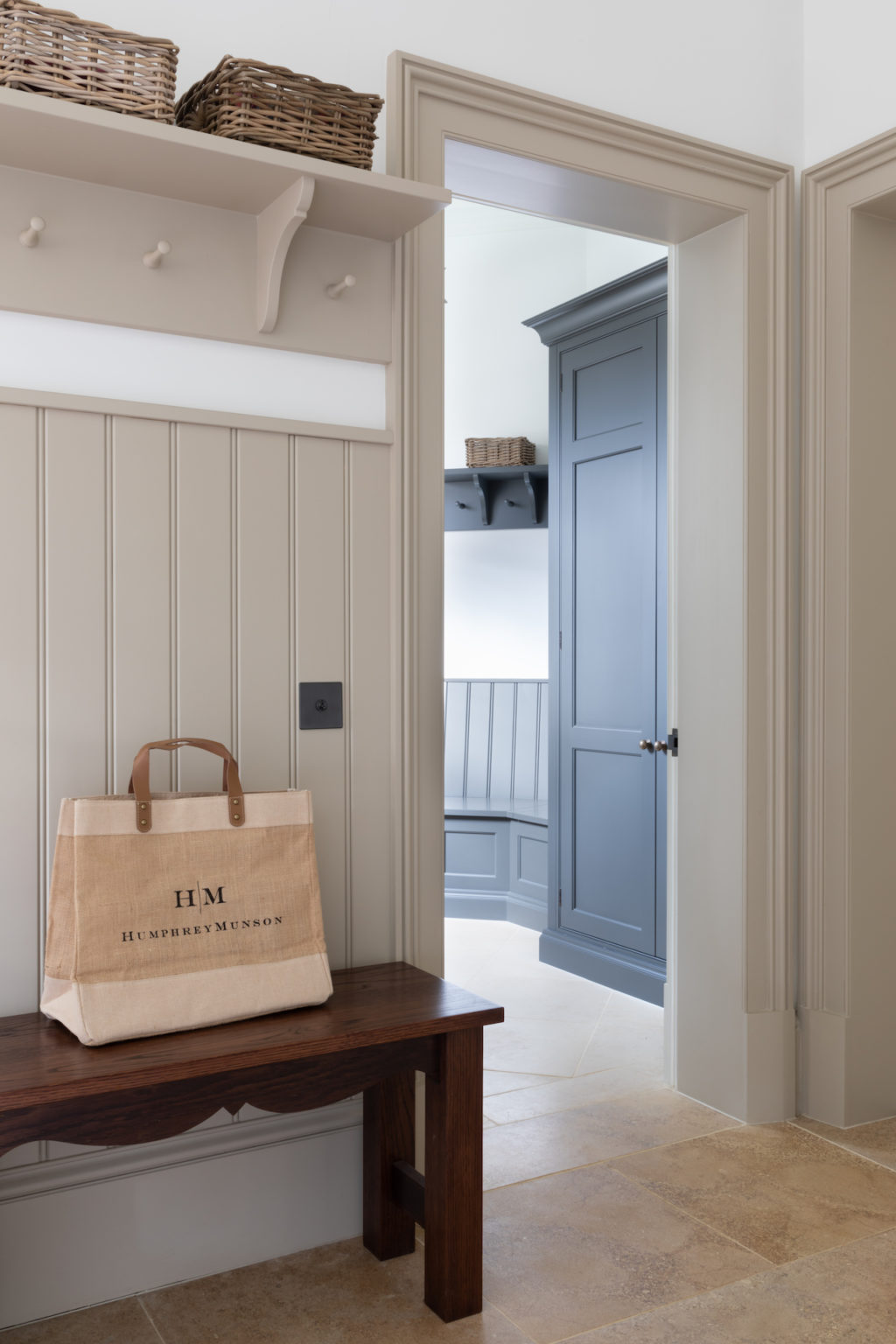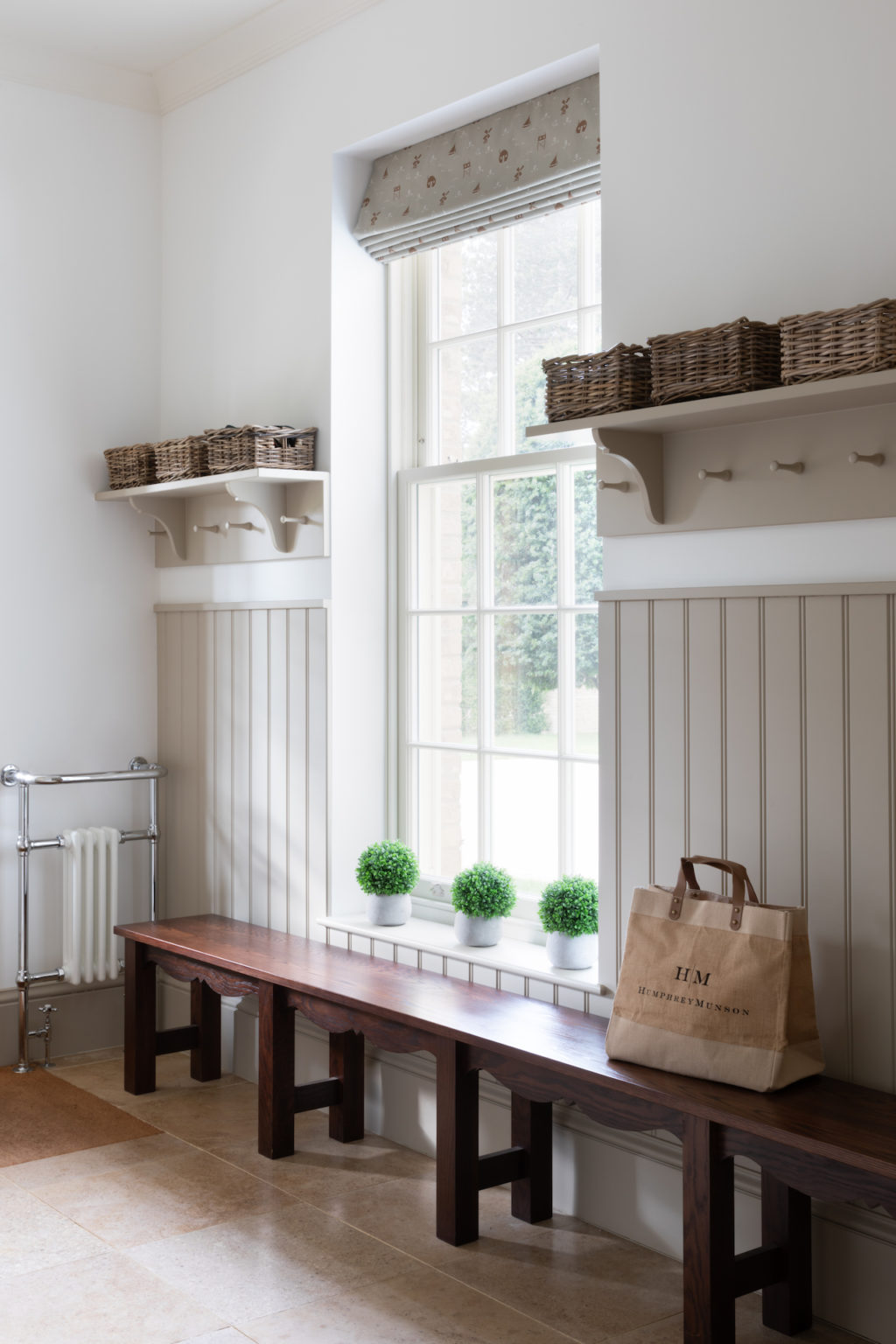An exceptionally well designed boot room space for residents and guests alike. Tall cabinetry hides away the plant equipment and server tech, while nearer the back door are laundry appliances hidden behind doors (just for dogs and muddy field clothing). Clever design perfectly captures the classic English country house mood.