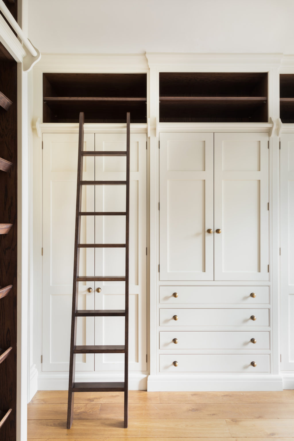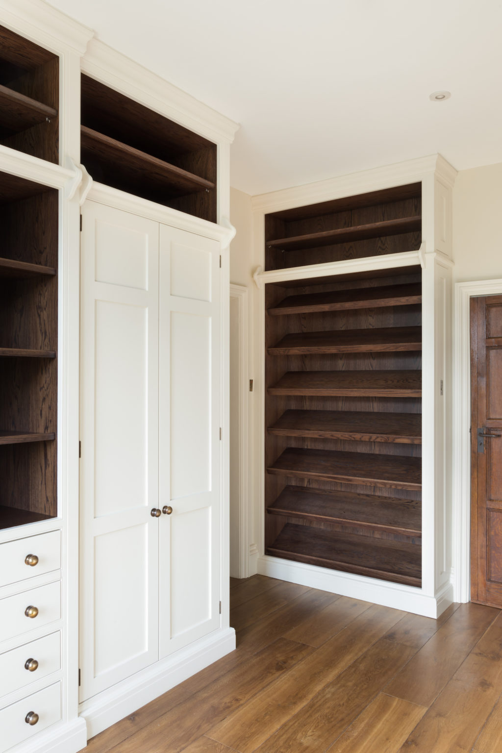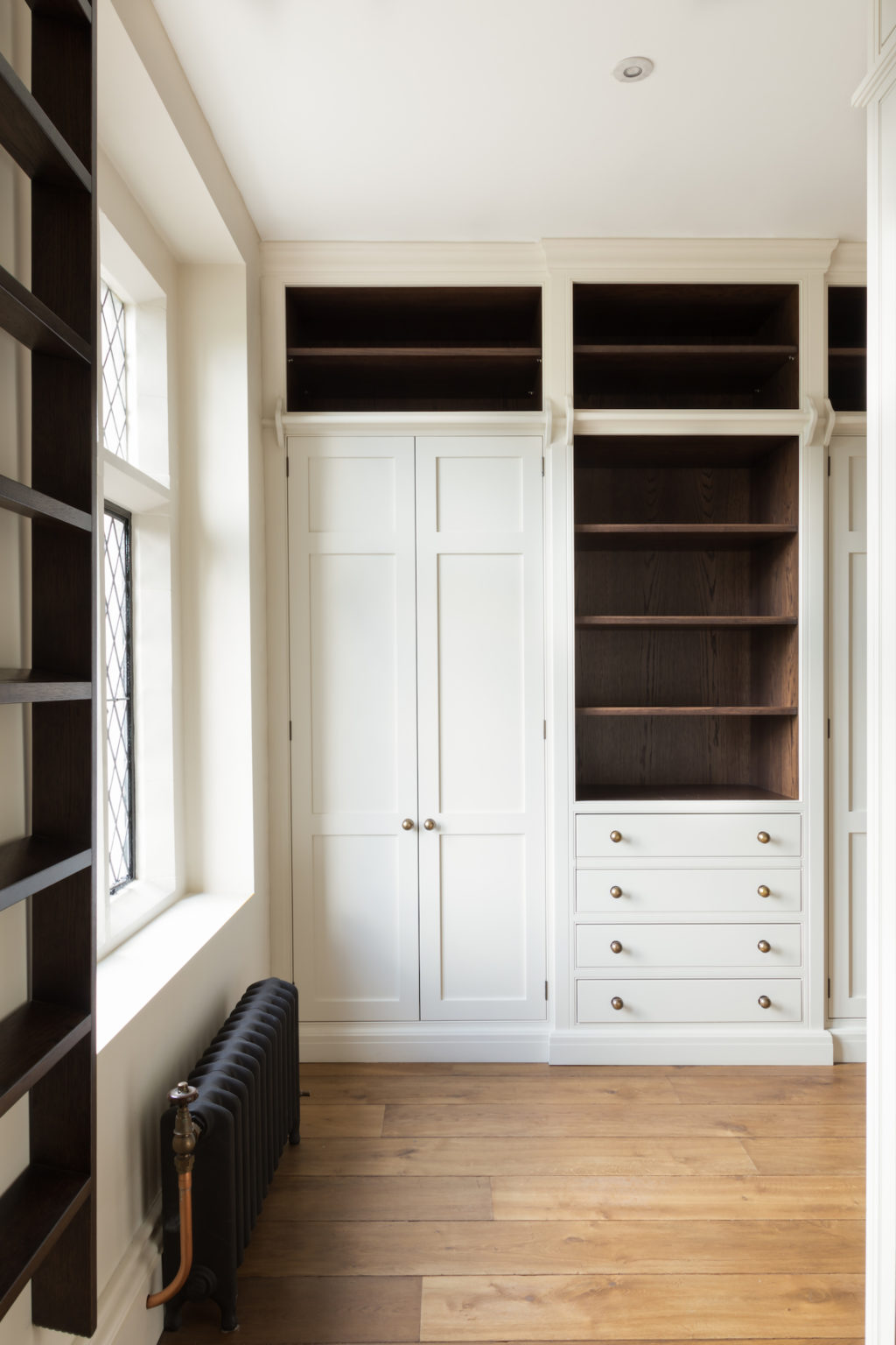 The principal dressing room at the Tudor Manor House project features a mix of open and closed storage with Portobello oak used throughout bringing warmth and character to the design.