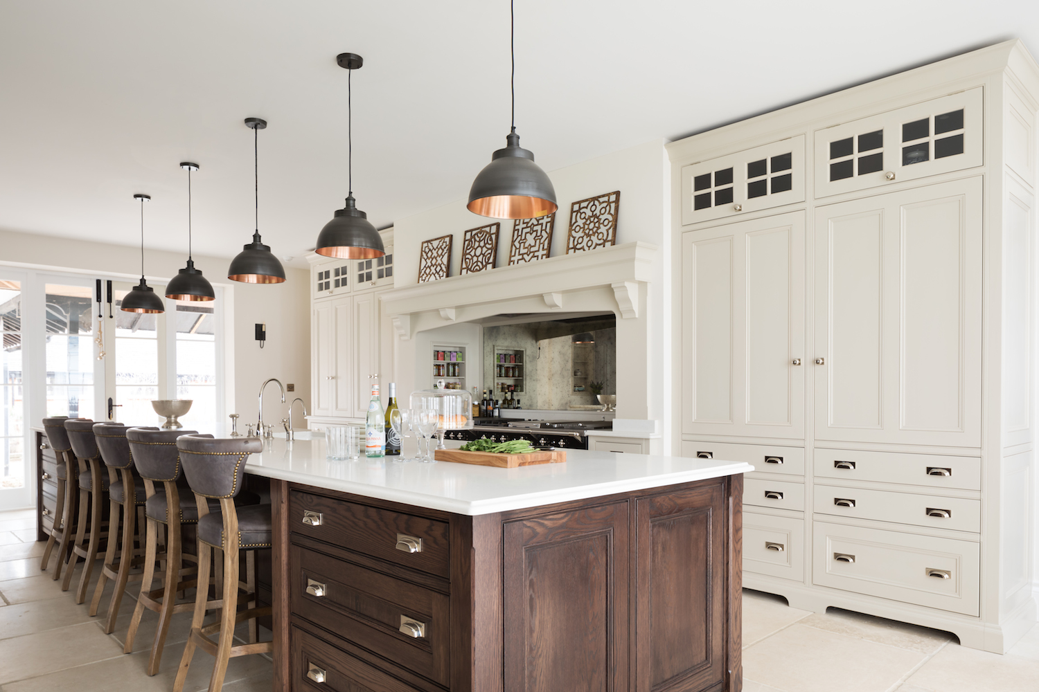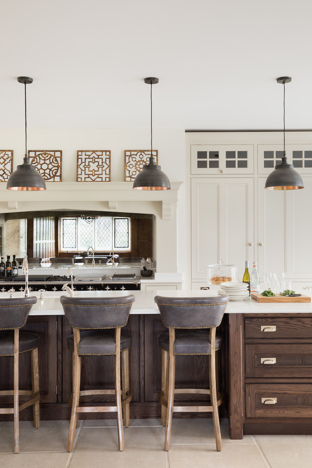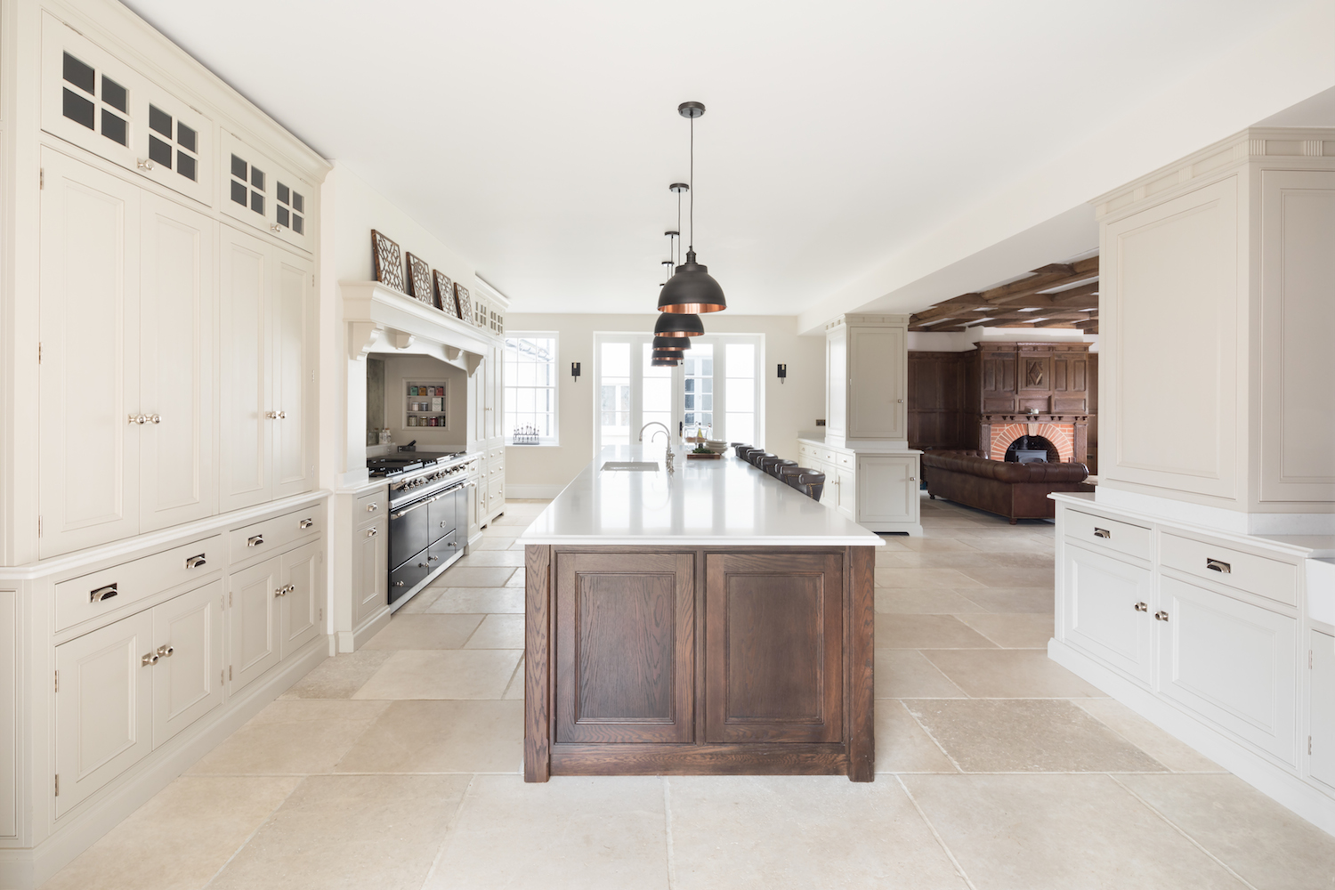 The focal point in this Tudor Manor house kitchen is the large false chimney with a Lacanche Belmont range cooker positioned centrally to ensure the space retains a true sense of symmetry and balance. The island, enormous by anyone’s standard, is proportional to the space and gives the family of five their dream kitchen.