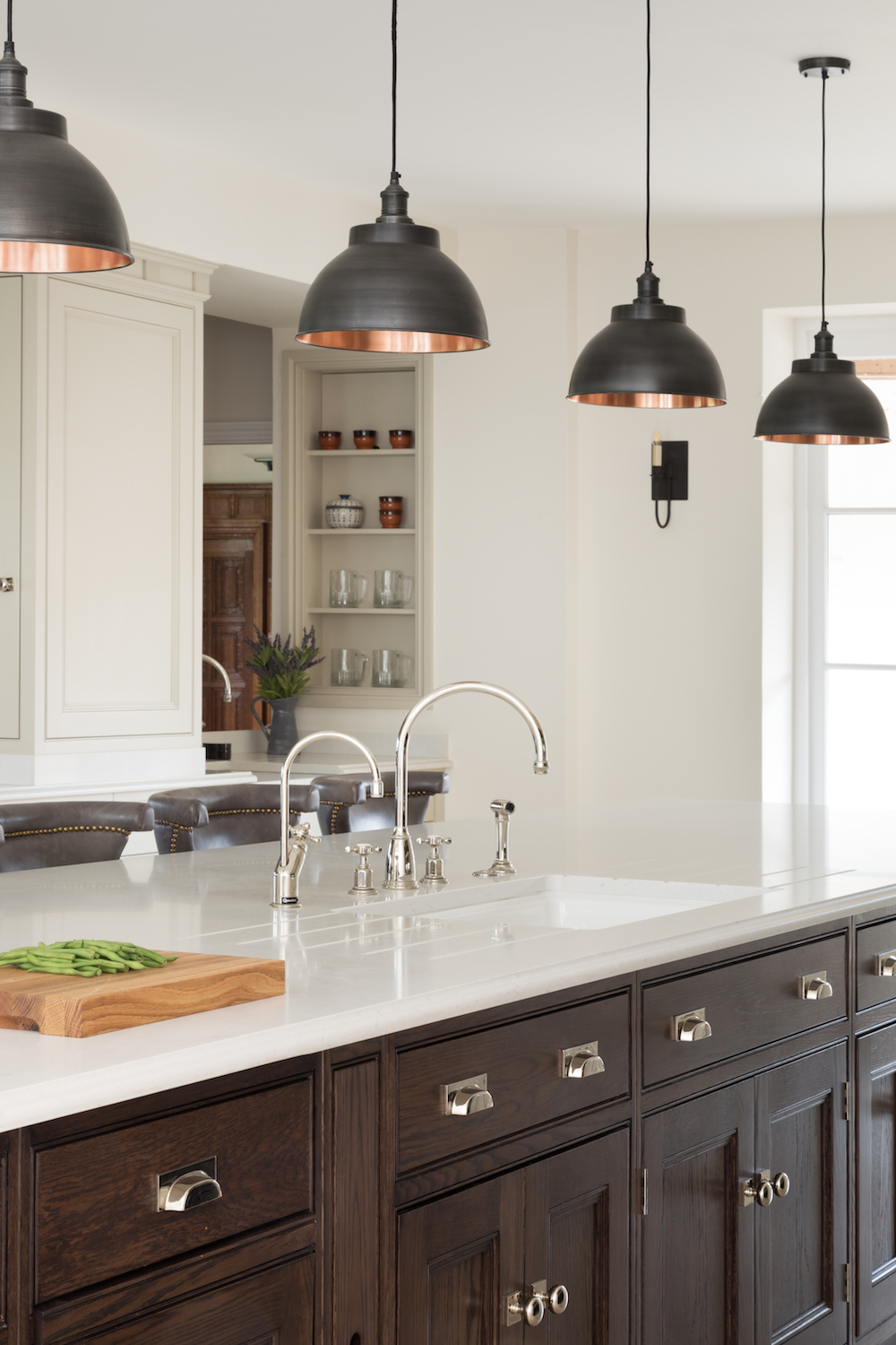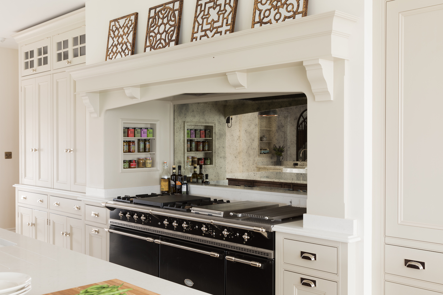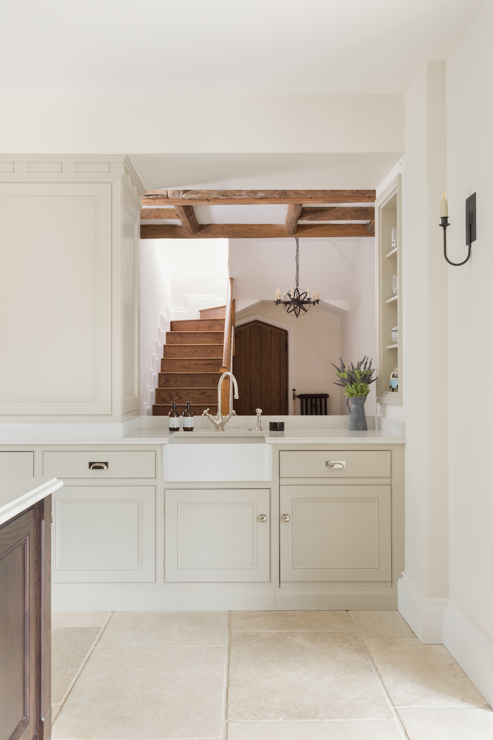 The focal point in this Tudor Manor house kitchen is the large false chimney with a Lacanche Belmont range cooker positioned centrally to ensure the space retains a true sense of symmetry and balance. The island, enormous by anyone’s standard, is proportional to the space and gives the family of five their dream kitchen.