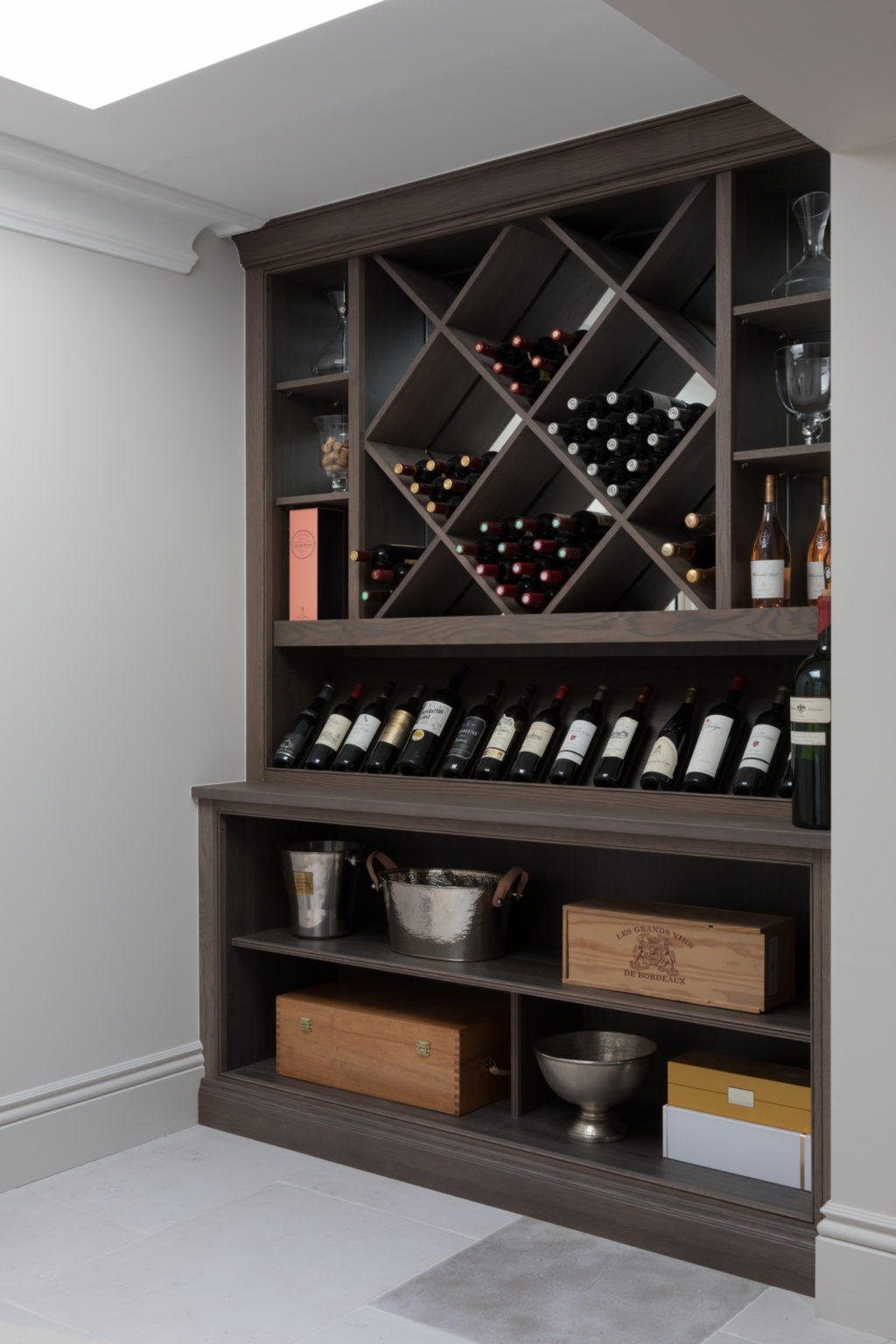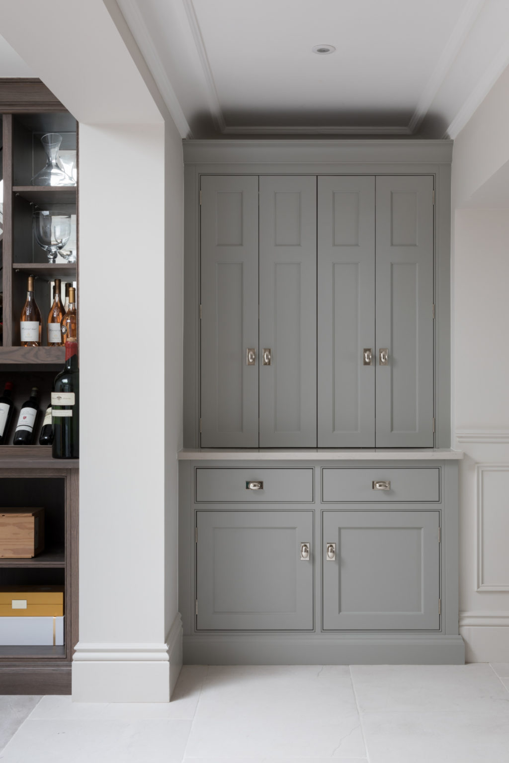 The bar and drinks area at the White House project was added at the last minute to ensure that the cabinetry flowed smoothly from the kitchen into the beautiful dining space. Berkeley oak provides a luxury finish to the wine storage, while the drinks bar is cleverly concealed behind bi-folding countertop cupboard doors, which are…