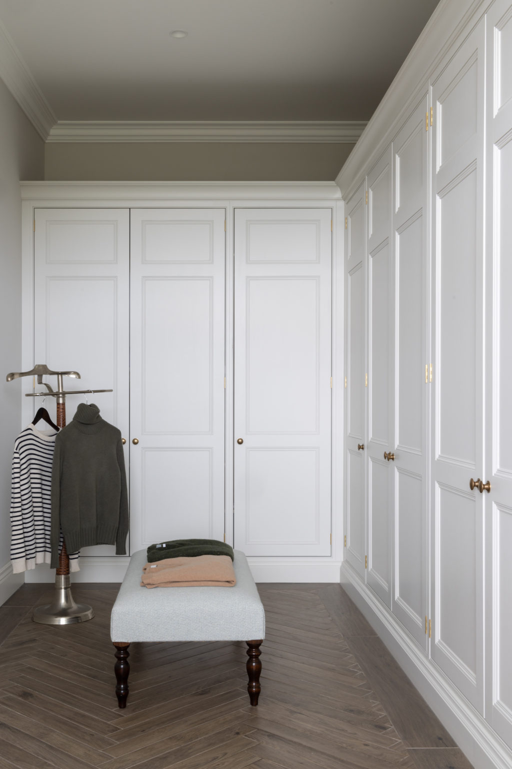 The principal bedroom at the Yorkshire project was designed with the adjoining dressing room leading into the bathroom. The Longford cabinetry is finished in Mainsail with Ledbury oak interiors and mid antique brass hardware.